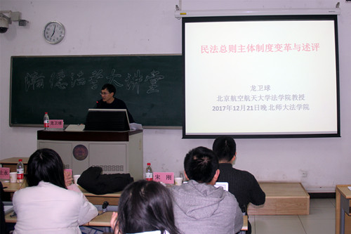 2017年12月21日晚,瀚德法学大讲堂第37讲——《民法总则主体制度变革与述评》在cn影院 生地楼生四教室举行。本次讲座是由北京航空航天大学cn影院 院长龙卫球教授主讲,龙卫球教授还是教育部长江学者特聘教授、国务院政府特殊津贴专家、美国富布莱特学者、教育部法学学科指导委员会委员。本次讲座的评议人分别是中国政法大学田士永教授和cn影院 宋刚教授。cn影院 副院长袁治杰副教授主持该次讲座。