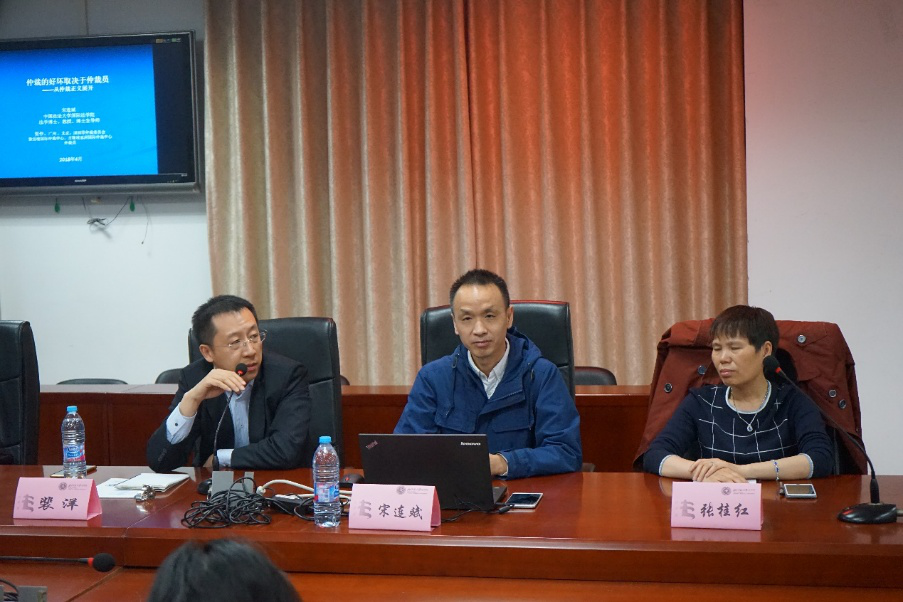 宋连斌教授首先从仲裁员资格讲起,现实的需要以及行业的严谨铸就了仲裁员的高标准高要求。紧接着宋教授立足于其丰富渊博的法学理论知识和作为仲裁员累积的丰富的实践经验,对仲裁员的职业伦理、仲裁责任等方面做了深入浅出的讲解及评论。作为教授学者,同时也作为资深法律工作者,宋教授也针对我国仲裁员制度的专业化进程这个话题做出了详尽的阐释,对我国仲裁发展现状进行了讲解和剖析,循循善诱,发人深思。宋教授多年来一直在新加坡等国际仲裁委员会任职工作,更加国际化的视野使得宋教授对仲裁的中外对比具有独到和深入的了解和看法,娓娓道来,生动而又严谨。