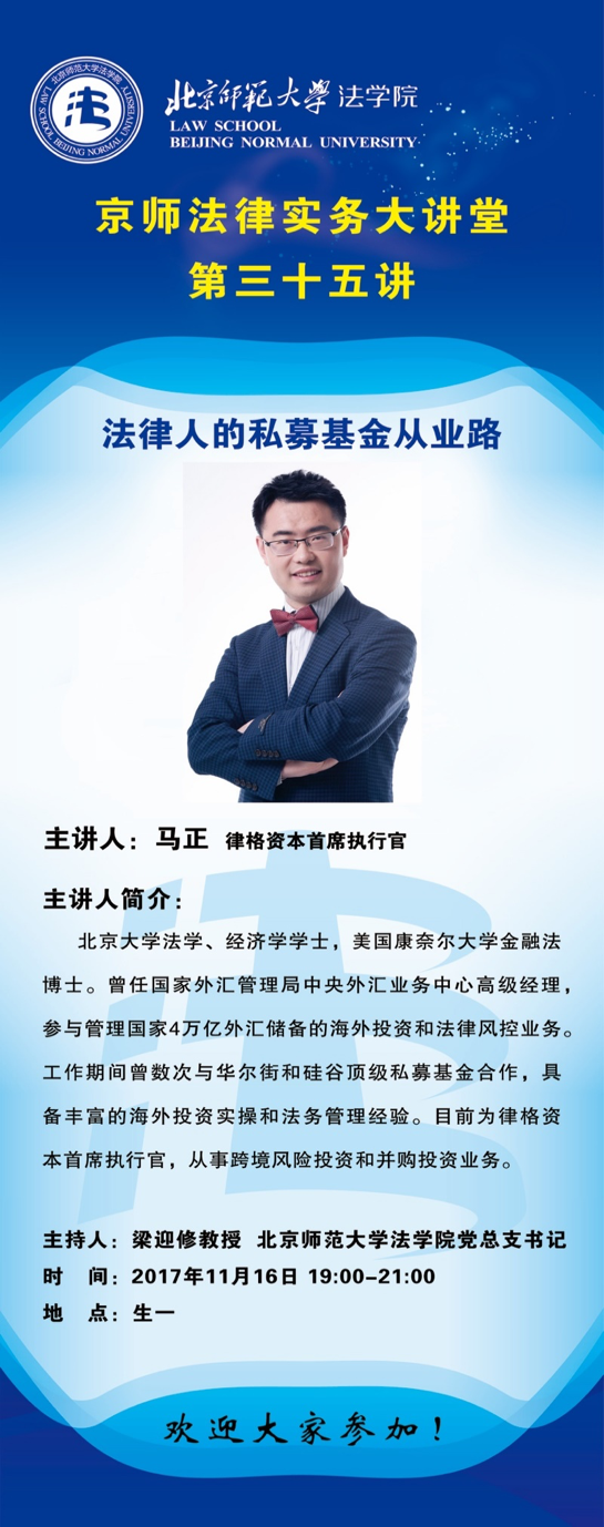 本次讲座特别邀请律格资本首席执行官马正博士担任主讲,演讲的主题是:“法律人的私募基金从业路”。