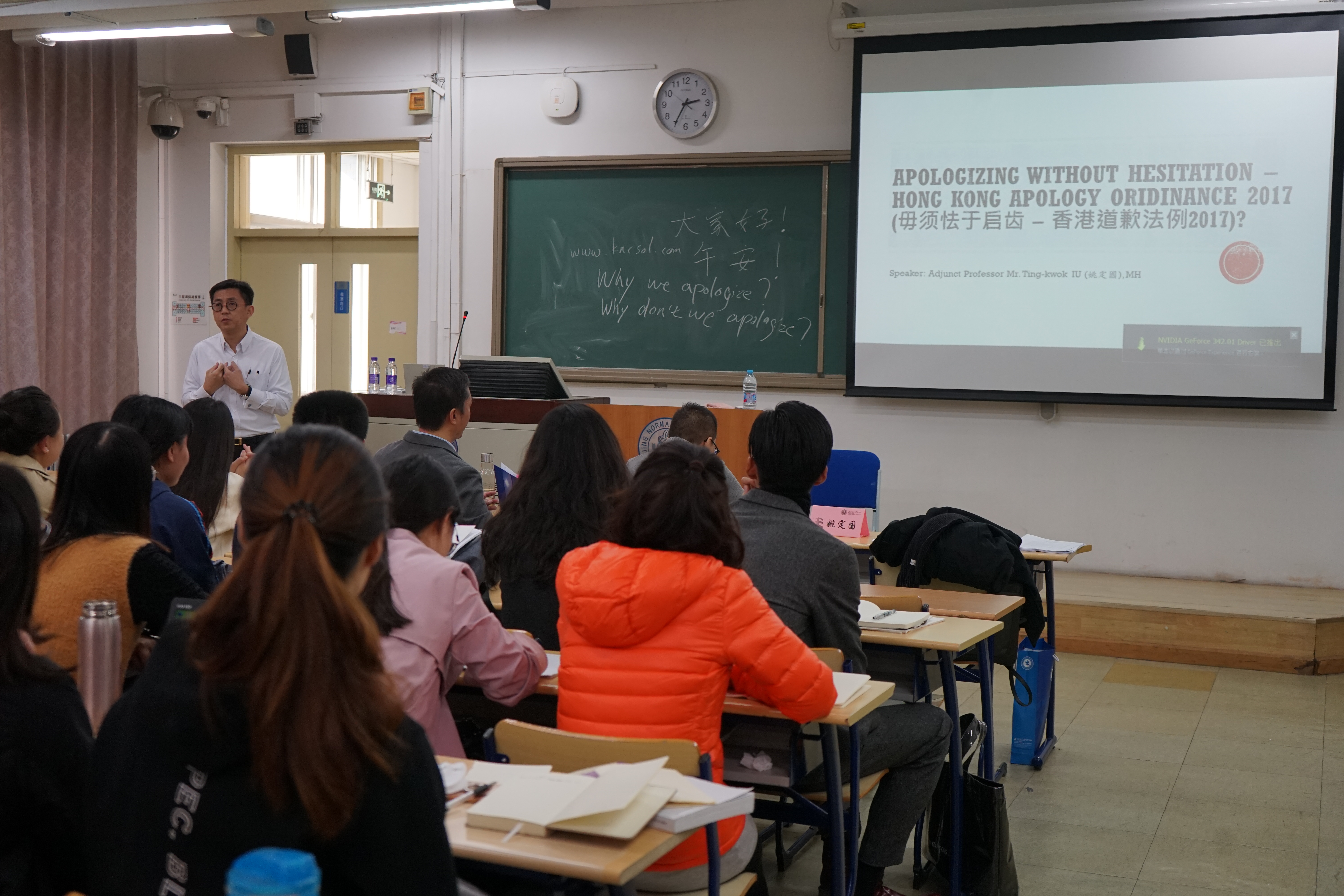 随后,由姚定国律师为同学们作了“毋须怯于启齿-香港道歉法例2017”的主题讲座。姚定国律师从大家熟知的马斯洛等级需求理论出发,深入浅出地介绍了香港道歉法例,分别从立法背景、目标、道歉的定义、适用情形以及道歉引发的责任等方面细致入微地进行了讲解。