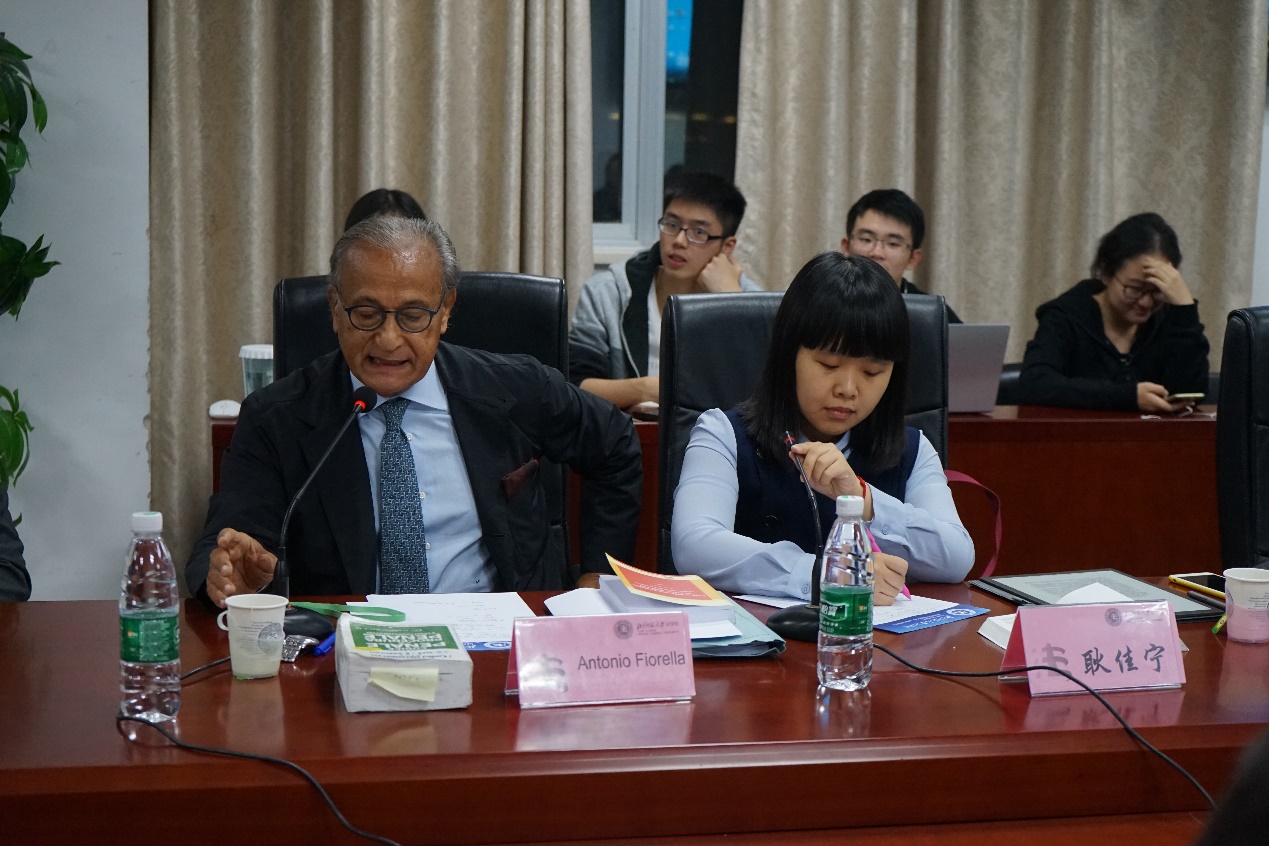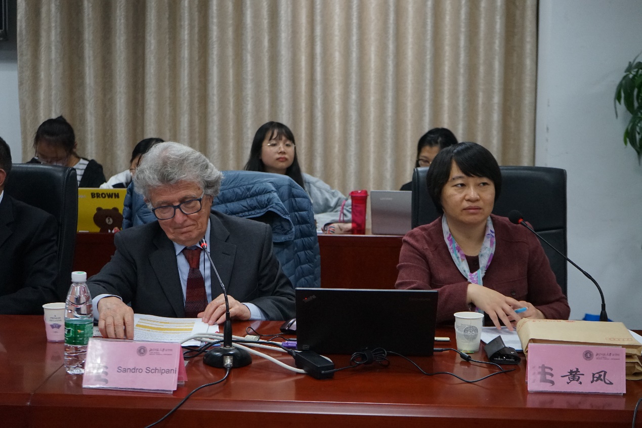 之后,黄风教授针对两位教授的讲座进行了评议。黄风教授认为意大利在单位犯罪的立法与宪法协调这一点,显示了高超的立法技艺,肯定了意大利单位犯罪立法的成就。袁治杰老师针对国家能否看成为一个单位,进而承担刑责的问题与菲奥莱拉教授进行了深入的学术交流。