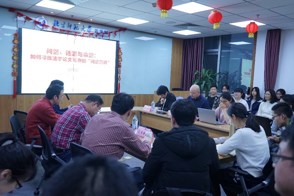 2018年3月12日,京师法学学术研究生沙龙第2期暨“法学京师”专题工作坊第2期“问题、话题与命题:如何寻找法学论文写作的问题意识”主题学术沙龙在后主楼cn影院 1922会议室成功举办。本次沙龙我们荣幸的邀请到了中国人民大学cn影院 、《法学家》副主编尤陈俊副教授担任主讲人。中国社会科学院法学研究所助理研究员王帅一老师、cn影院 基础理论法学教研中心主任夏扬教授、cn影院 马剑银副教授、cn影院 师资博士后李德嘉老师出席了本次讲座。讲座由cn影院 副院长柴荣教授主持。此外,cn影院 的部分学生也积极参与了此次研讨。