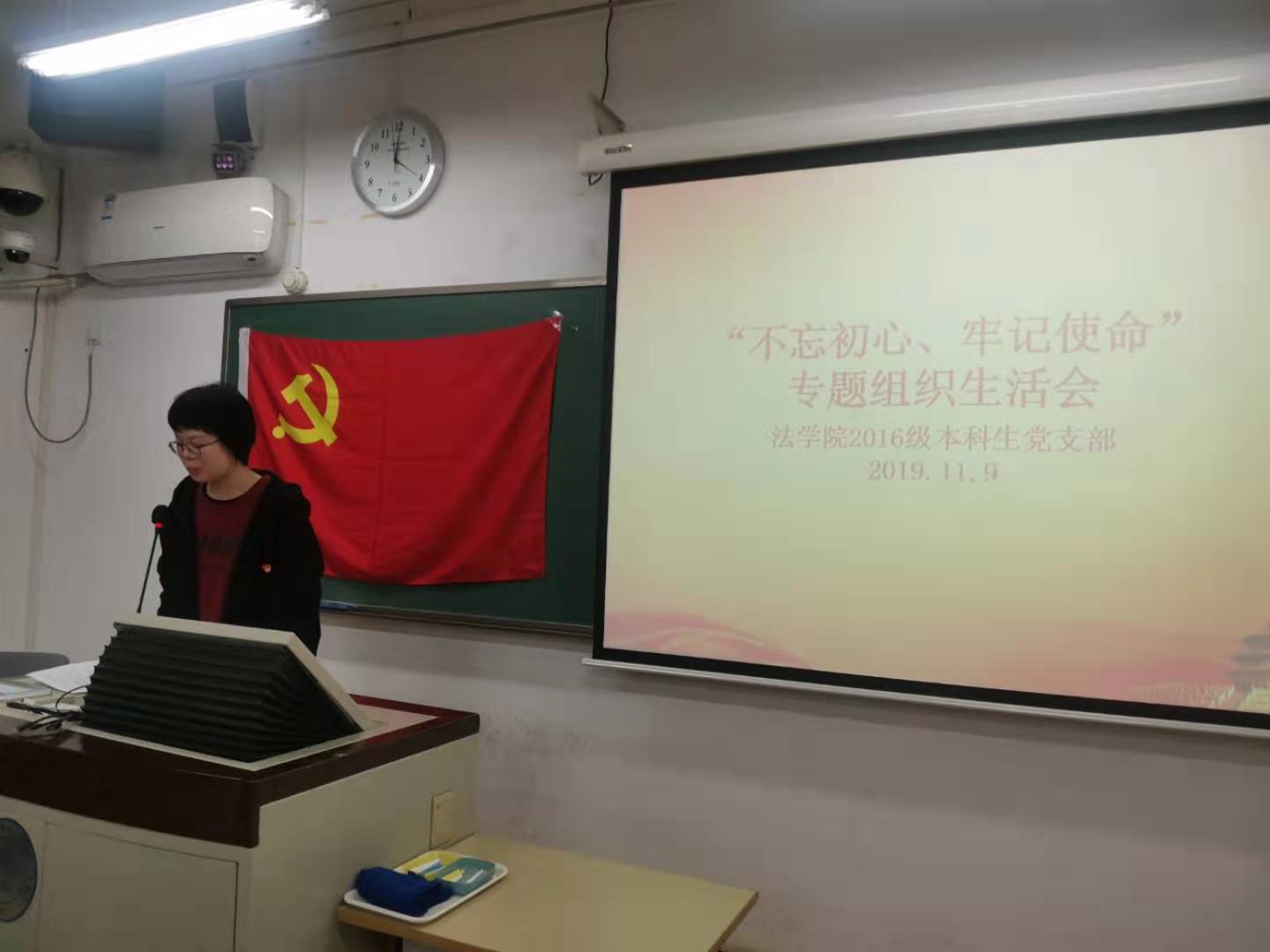 为认真贯彻落实“不忘初心,牢记使命”主题教育精神,2019年11月9日,cn影院 2016级本科生党支部在教四109举办“不忘初心,牢记使命”专题组织生活会。党支部对接指导老师马丽亚老师、支部党员和入党积极分子参加了本次活动。会议由支部书记武彦君主持。