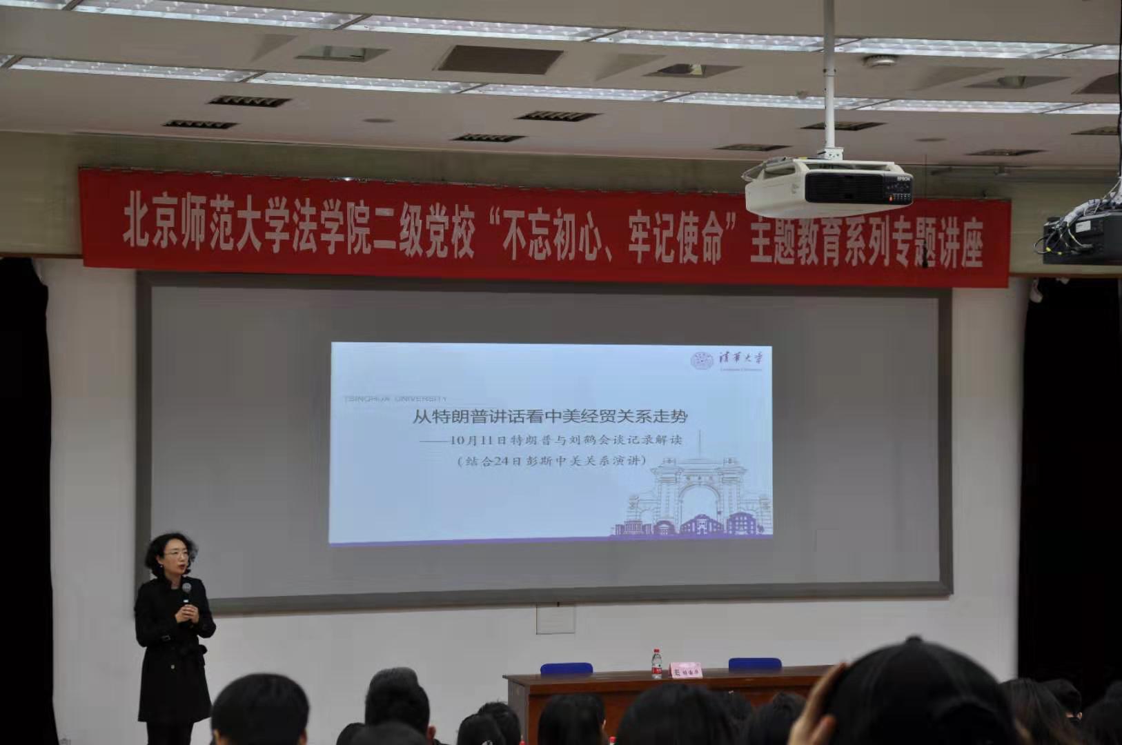 2019年11月2日上午,cn影院 二级党校“不忘初心、牢记使命”主题教育专题讲座暨入党积极分子培训理论学习讲座在教九502顺利举行。cn影院 党委书记梁迎修、党委副书记郭雅婷及在职教工党员、退休党员、学生党员、入党积极分子等300余人参加了本次讲座,本次讲座邀请到了清华大学cn影院 杨国华教授以“从特朗普讲话看中美经贸关系走势:10月11日特朗普与刘鹤会谈记录解读”为主题为cn影院 师生带来精彩讲座。本次活动由郭雅婷主持。