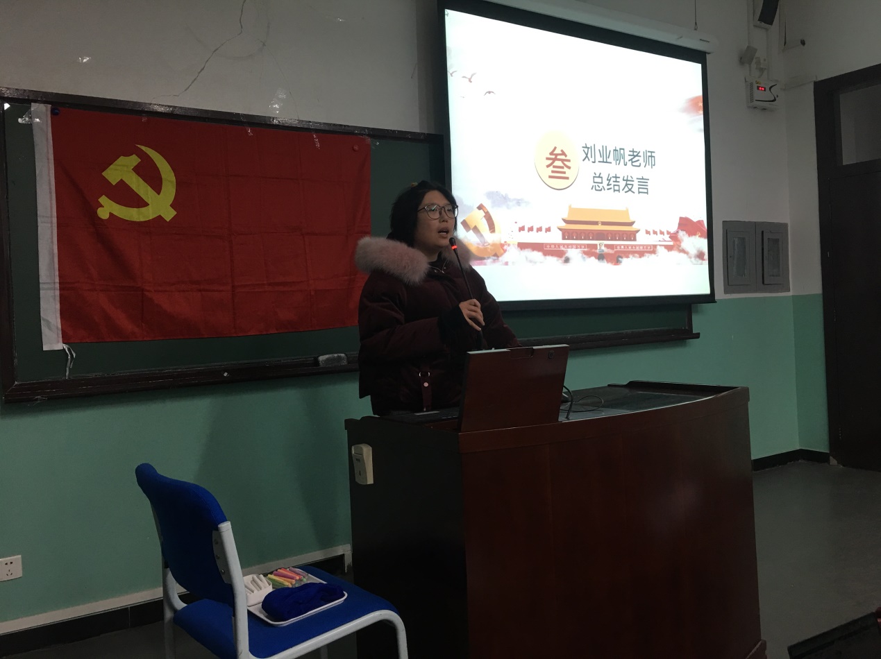 会议最后一项是刘业帆老师进行会议总结。刘老师总结到:不论是党员还是积极分子,都要以五四运动所宣扬的精神作为指引。党员同学们不仅要在组织上入党,更要在思想上入党,加强自身的党性意识,努力提高政治思想水平。积极分子同学也要以党员的标准要求自己,加强理论学习,积极向党组织靠拢。