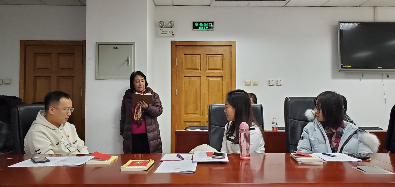 在第二个环节,党支部严格按照程序召开关于讨论接收王筱同志为中共预备党员的会议。王筱同志宣读了《入党志愿书》,汇报了对党的认识、入党动机、本人履历、家庭和主要社会关系情况,以及需向党组织说明的问题。宣读完毕之后,王筱的入党介绍人李树训同志与杜伟伟同志分别介绍了王筱的有关情况,并对其能否入党发表了各自看法。随后,党支部组织委员陈海涛同志代表支部委员会报告了王筱同志的审查情况。与会的党员黎昭权同志、蒋宗言同志、侯怡宁同志、郑淑珺等同志分别针对王筱同志能否入党发表了各自看法。紧接着,与会正式党员进行了无记名投票,由郭如愿同志负责唱票,陈轩禹同志负责监票,侯怡宁同志负责计票,共十四票赞成票。郭如愿代表支委会向支部大会宣读了由支委会根据现场会议大家的发言及具体意见形成的草拟决议。同志们一致举手通过了草拟决议,并一致同意上报上级党委审批。王筱同志结合自身的经历谈了入党的感悟。最后,支部书记郭如愿对王筱同志表示祝贺,郭如愿讲道,“今天的日子对于王筱同志而言注定要牢记一生,需要明确的是,党员身份不是一种荣誉,而是一种责任与担当,王筱今天在程序上入了党,但我想这仅仅是个开始,思想上入党才是一生要做的事情,希望王筱同志在以后的工作、学习及生活上能够内化于心,外化于行。时刻牢记自己的党员身份,将党的宗旨与理念转化为自己的实际行动。”