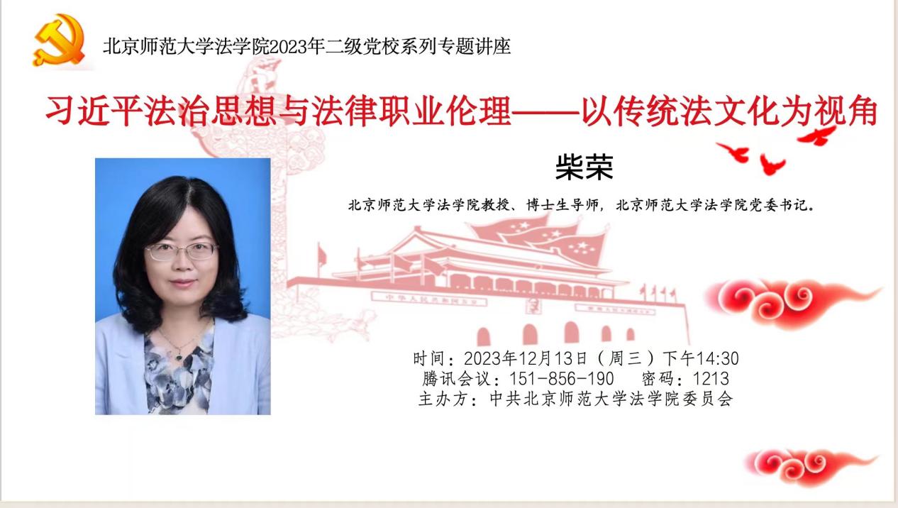 为了贯彻中共中央和国务院对新时代法学教育和法学理论研究的要求,中共cn影院 委员会于2023年12月13日下午成功举办了二级党校系列专题讲座。由cn影院 党委书记柴荣教授主讲的“习近平法治思想与法律职业伦理——以传统法文化为视角”专题讲座在线上精彩呈现,cn影院 百余师生积极参与。