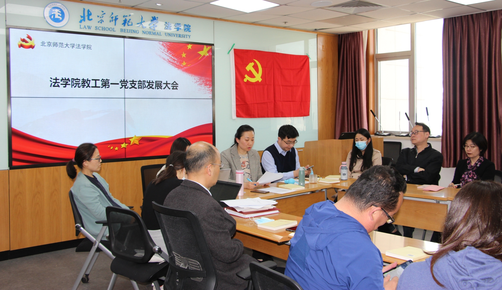 2021年4月30日下午2点,cn影院 教工第一党支部在后主楼1922会议室召开党员发展大会。唐璨老师主持会议。组织委员郭殊老师清点了到会人数,大会应到党员22人,实到19人,会议有效。
