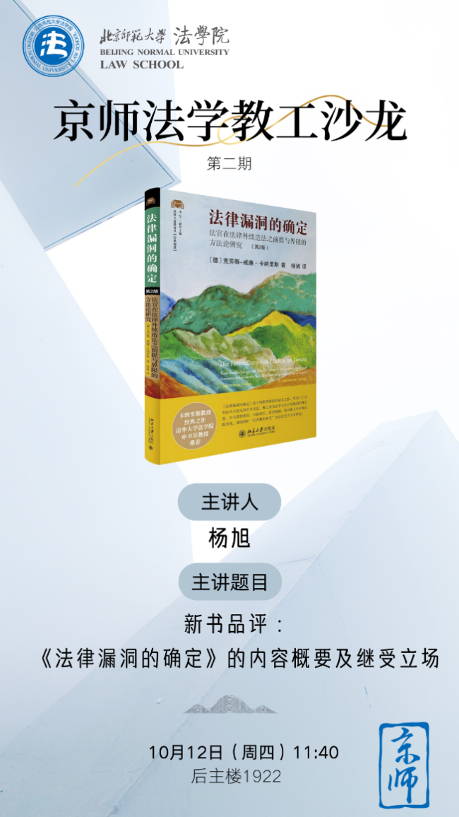 10月12日,北师大cn影院 举行本学期第二期“京师法学教工沙龙”。本次沙龙的主题是针对《法律漏洞的确定:法官在法律外续造法之前提与界限的方法论研究(第2版)》的新书品评,cn影院 杨旭老师主讲《法律与法的评价互动:卡纳里斯的法律漏洞确定理论评述》。cn影院 工会主席严厚福副教授主持本次沙龙。
