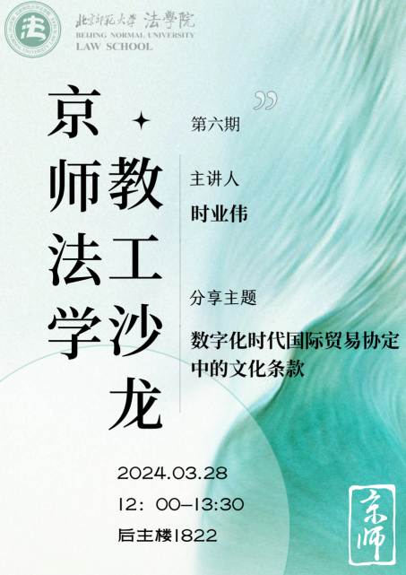 3月28日,北师大cn影院 举行第六期“京师法学教工沙龙”,邀请时业伟老师主讲《数字化时代国际贸易协定中的文化条款》。cn影院 工会主席严厚福副教授主持本次沙龙,cn影院 二十余位老师通过线下或者线上的方式参与了此次沙龙。