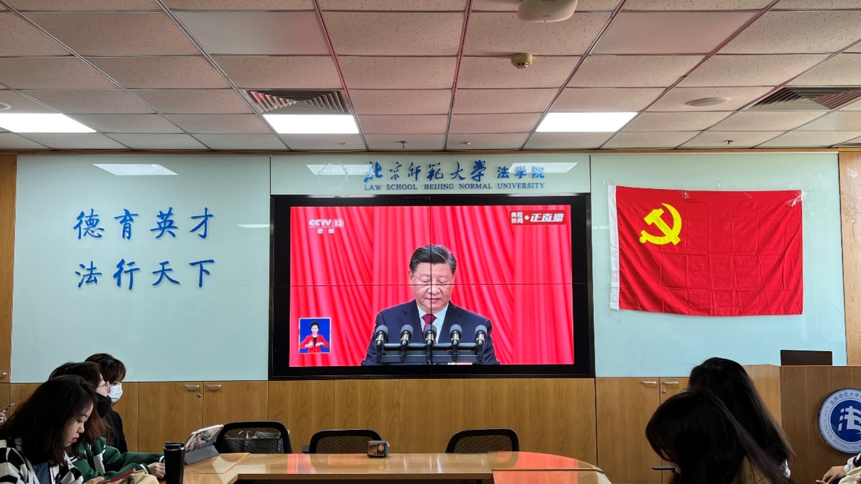 10月16日上午,举世瞩目的中国共产党第二十次全国代表大会在人民大会堂隆重开幕,习近平总书记代表十九届中央委员会向大会作报告。cn影院 2022级法律硕士第二党支部、2022级法律硕士第三党支部的全体党员在后主楼1922教室共聚一堂,共同聆听这次重要的会议报告。会场内鲜红的党旗分外醒目,气氛隆重而热烈。