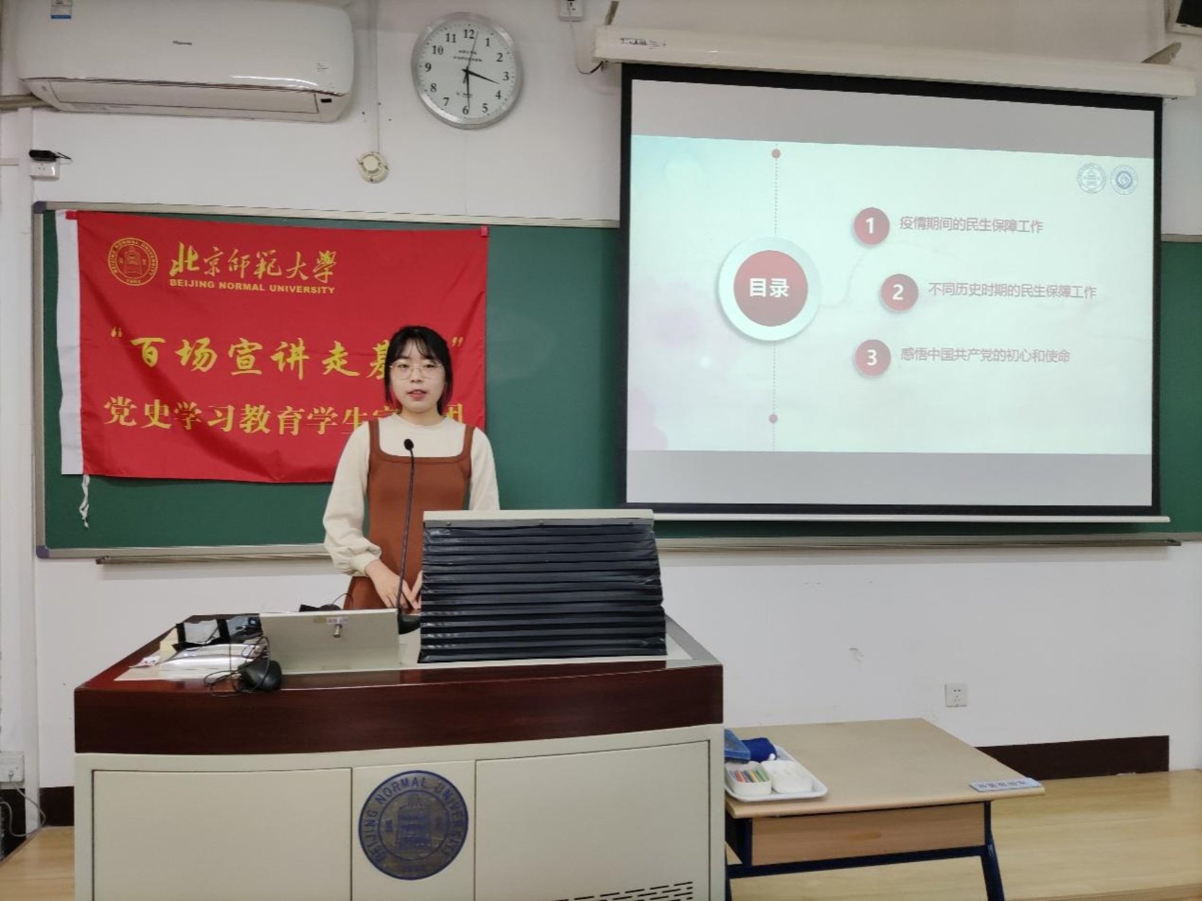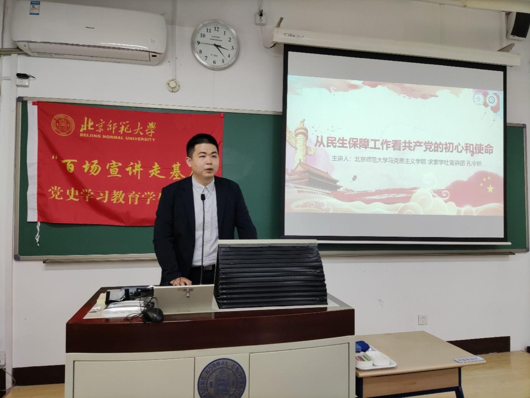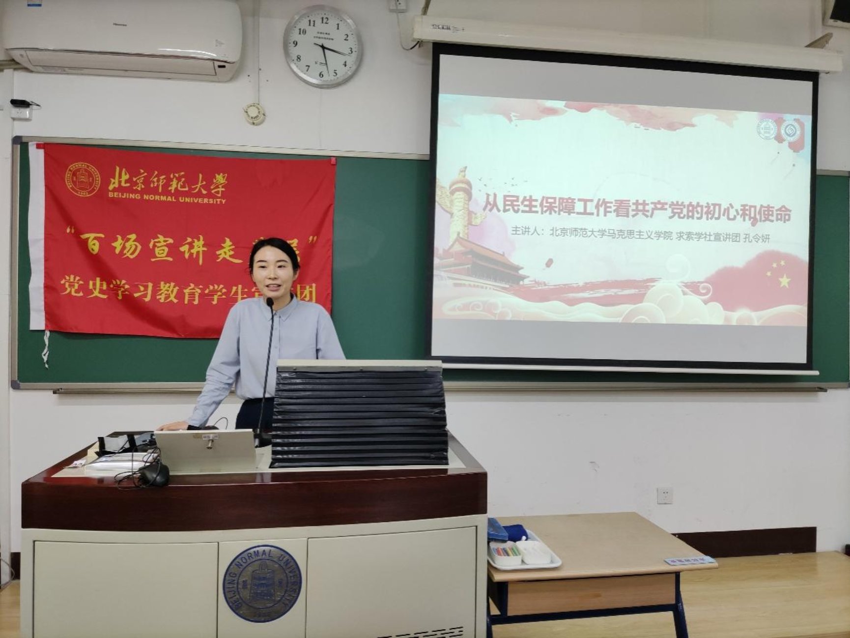然后,来自cn影院 马克思主义学院、求索学社宣讲团的孔令妍同志进行了以《从民生保障工作看共产党的初心和使命》为题为大家进行了主题宣讲。孔同志从疫情期间的民生保障工作、不同历史时期的民生保障工作和感悟中国共产党的初心和使命三个角度完成宣讲,让在场的各位同志更深刻地认识到我们党是一以贯之坚持初心的党,党的一切工作都是从人民利益出发,从人民利益着想,我们作为青年党员要认识到自己的使命,要敢于担当,善于担当。