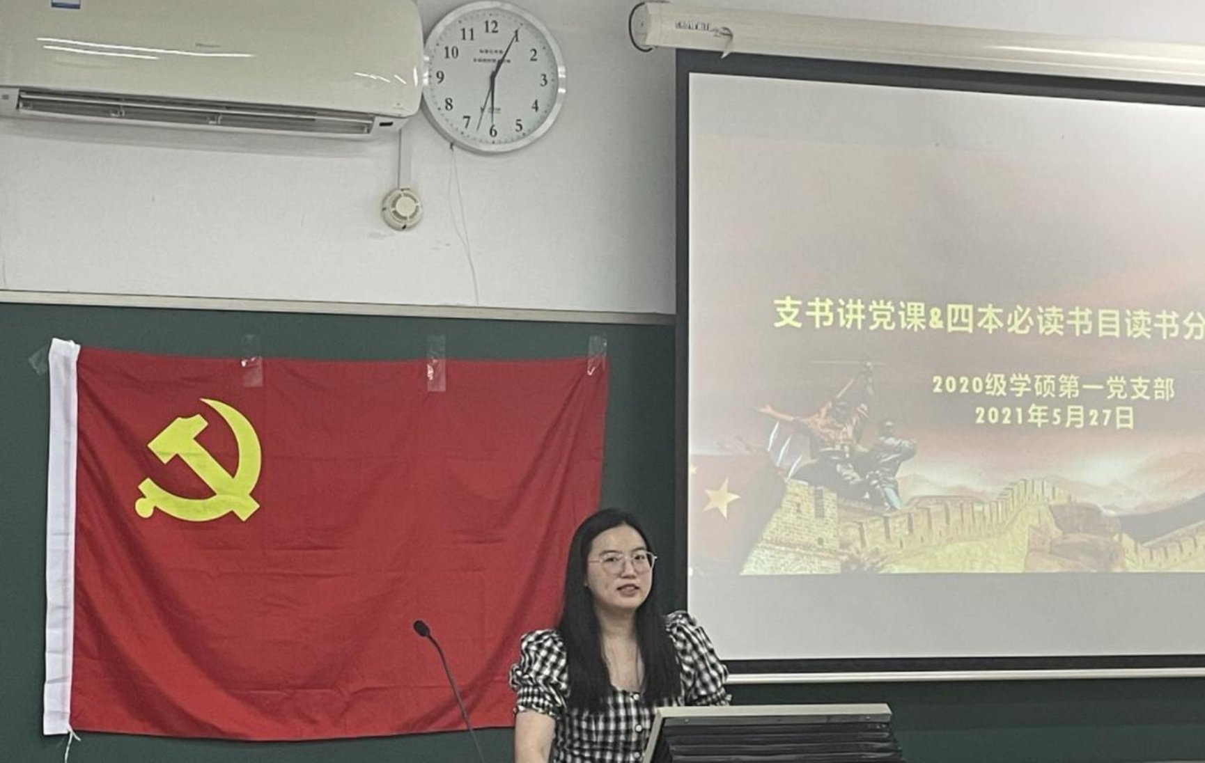 党课是提高党员素质、增强党性观念、发挥党员先锋模范作用的行之有效的教育形式。支部书记讲党课,不仅是发挥其“领头羊”、“掌舵手”作用,更是主动履行职责,提升基层党支部战斗力体现。527日,2020级学硕第一党支部在教二104开展“支书讲党课暨四本必读书目读书分享会”活动,本次活动共18人参加,其中正式党员应到16人,实到13人,3人因事请假,5名入党积极分子也参加了此次活动。活动由支部书记林思丽主持。