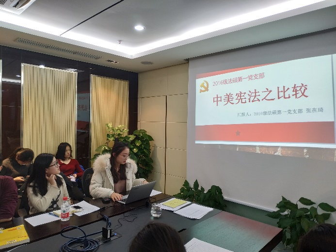 在更加熟悉彼此以后,活动进入到第二个环节——《宪法》微党课。在这个环节中,我支部同学充分发挥自己的专业特长,贾广启、段挺挺、陈舒、张在琦、戴玲和陈佳伟六位同学精心准备了关于宪法在六个方面的微党课,在本次共建活动中全面系统、生动活泼地向大家介绍了我国宪法的相关知识。这六个方面具体包括:我国宪法的发展历程、修改历程及意义,我国宪法的基本原则及具体内涵,我国宪法平等权和自由权冲突的化解思路,我国宪法和美国宪法的比较,我国宪法规定的公民的基本权利及基本权利受侵害时的司法救济途径,我国宪法的修改方式、修改机关、修改程序及宪法的解释权、宪法修正案的性质。