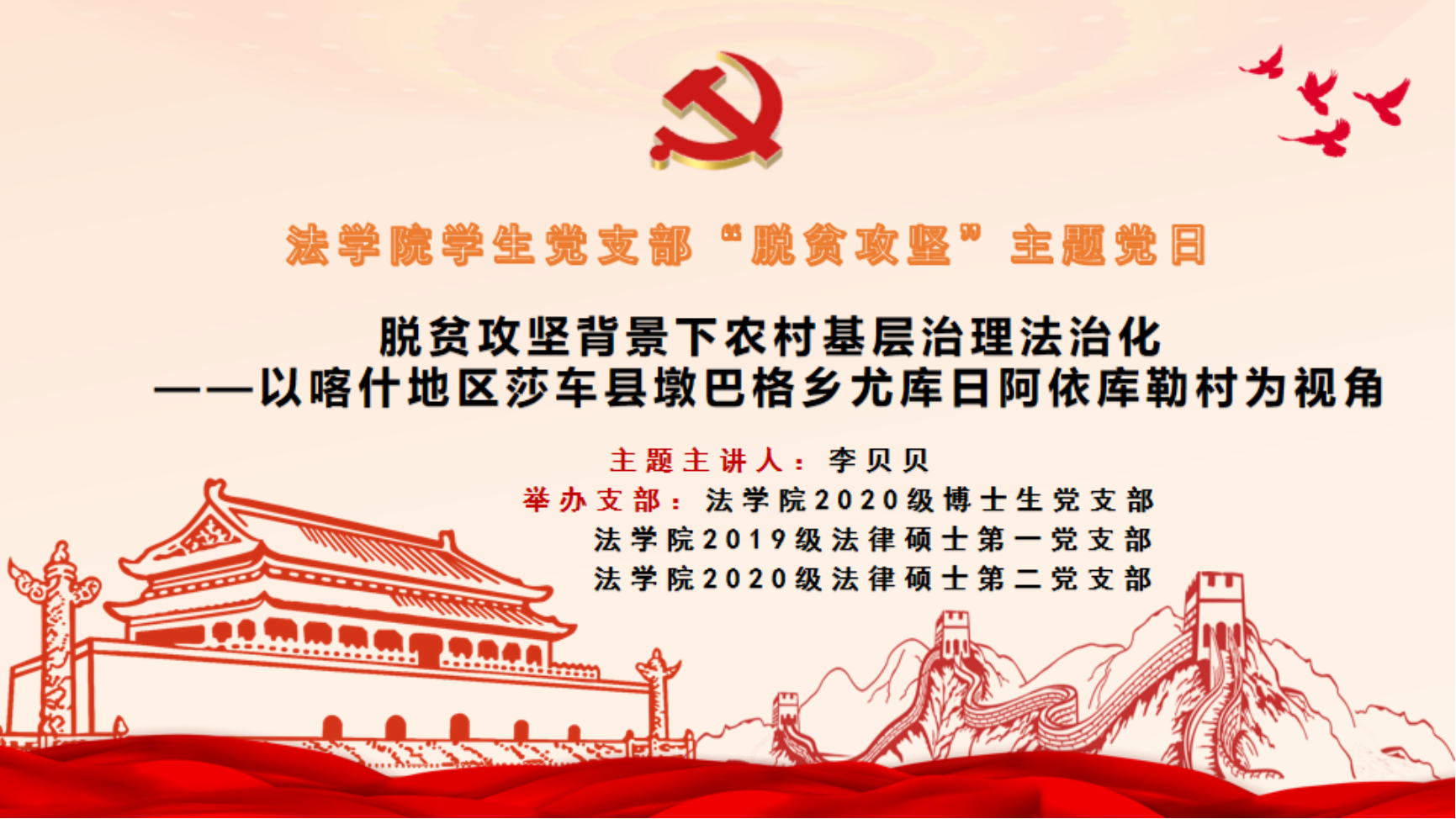 2020年是全面建成小康社会和“十三·五”规划收官之年,是决战决胜脱贫攻坚之年。在我国第7个扶贫日和世界第28个国际消除贫困日来临之际,cn影院 学生党支部“脱贫攻坚”主题党日活动于2020年10月16日14时在教二312教室举办,活动邀请cn影院 2020级博士研究生、新疆大学讲师、曾任莎车县驻村第一书记助理(驻村时间为2018年1月至2020年8月)李贝贝同志担任主讲人。本次活动分为“脱贫攻坚驻村工作实例分享”和“就业能力涵养提升”两个单元,由2020级博士党支部书记詹周达同志和2019级法律硕士第一党支部书记高艺璇同志分别主持,cn影院 2020级博士生支部、2019级法律硕士第一党支部和2020级法律硕士第二党支部参加本次活动。学校党委副书记李晓兵老师、cn影院 党委副书记郭雅婷老师到会指导,2020级博士生党支部对接指导教师、cn影院 党委委员、副院长李滨老师应邀参加脱贫攻坚实例分享环节。