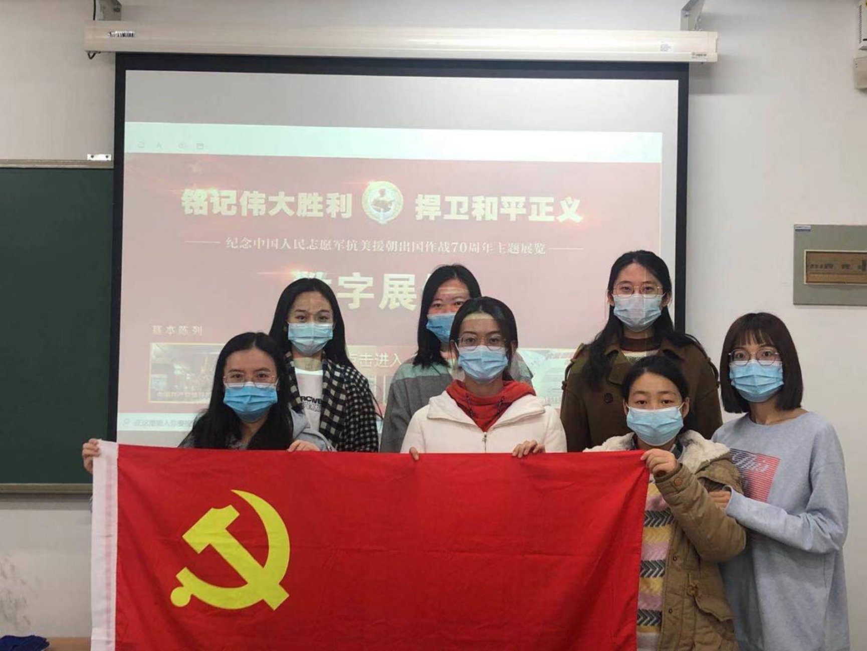 2020年10月29日,支部响应学校号召,学习贯彻习近平总书记在纪念中国人民志愿军出国作战70周年大会上的重要讲话精神,于前主楼四季厅组织全体积极分子观看抗美援朝影展。常欢同志向入党积极分子讲述图片中的故事、抗美援朝的重要意义、以及在抗美援朝中优秀共产党员的杰出事迹,强调今天重温抗美援朝精神,是希望各个积极分子更好地守初心,担使命。全体积极分子表示将会继续认真学习抗美援朝精神,增强四个意识,做好两个维护。
