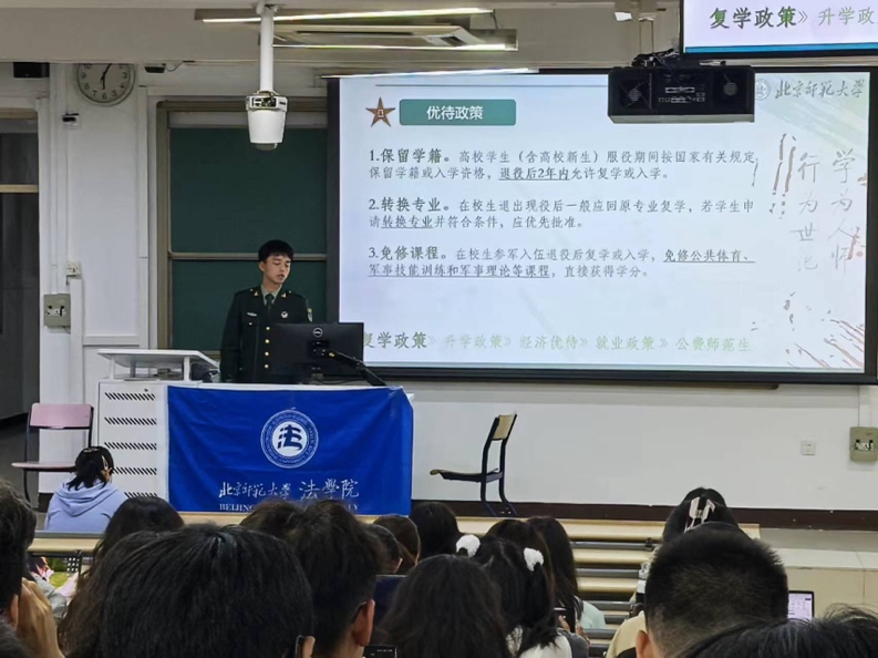 征兵宣讲会由徐淑琳老师主持。cn影院 邀请我校体育与运动学院退役本科生王鸿为2024级本科新生进行宣讲。王鸿同学对参军入伍的条件标准、应征入伍基本流程等相关政策内容进行解读,并建议大家通过全国征兵网、cn影院 党委学生工作部网站或京师学工公众号获取相关征兵信息。最后,王鸿师兄还鼓励大家积极响应国家号召,投身国防建设。