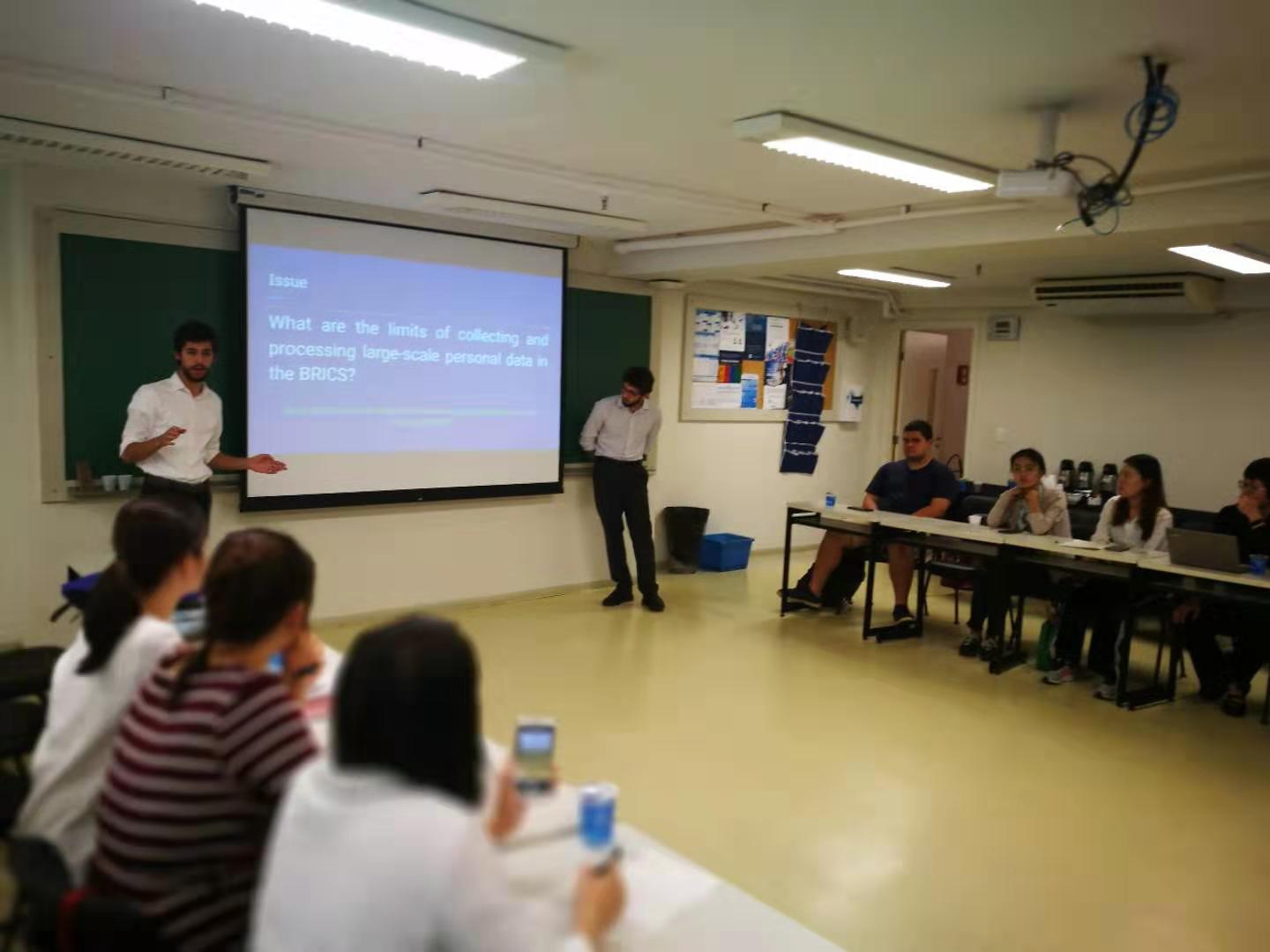 10月2日上午,中巴师生对金砖五国私法的相关问题展开研讨。会议的目的是通过与中国、俄罗斯和印度等金砖国家国间的比较,探讨巴西法治建设中的问题。巴方学生进行PPT展示后,双方师生展开了热烈的讨论,主要探讨巴西和中国私法面临的挑战,并就北师大与FGV大学在比较法研究、特别是各自国家核心案例翻译方面可能的合作进行了展望。