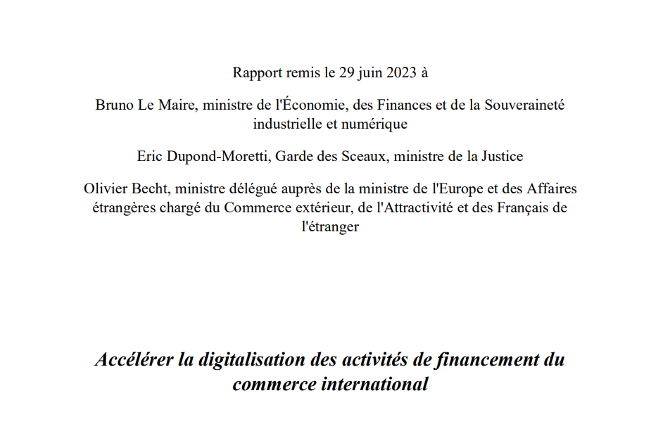 该报告是由法国政府财政部组织专家撰写,向法国经济财政工业及数字主权部长、内务及司法部长、欧洲与外交外贸部长等高官提交的政策分析性文件。报告指出,国际贸易的基础是复杂的纸质单据链,但是由于法国法律以及大多数法律制度都不认可所谓的可转让单证的电子形式,专业人员之间的国际贸易数字化水平远远落后于电子商务。《联合国国际贸易法委员会电子可转让记录示范法》旨在为各国建立适应国际贸易单证数字化的法律框架提供参考。法国应该尽快进行必要的改革,以使数字记录可以满足短期国际贸易融资现代化的迫切需要,通过增强法国法律在国际贸易领域数字化能力,增强法国的竞争力并促进与其商业伙伴的交流,利用融资杠杆可以增强融资活动吸引力。