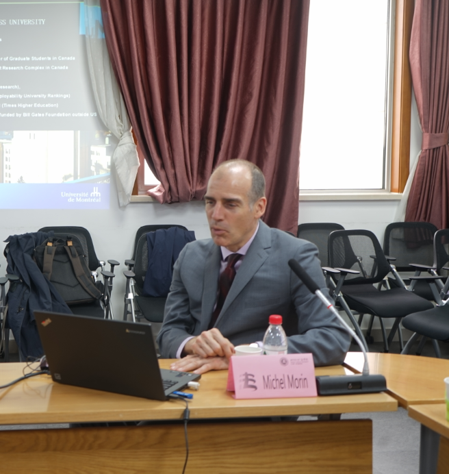 随后,Michel Morin教授向同学们介绍了蒙特利尔大学cn影院 的建院时间、院系宗旨、地理位置等情况,重点介绍了国际商法硕士项目,就生源情况、课程与学分设置、申请条件和程序、奖学金等情况进行了详细而具体的说明。