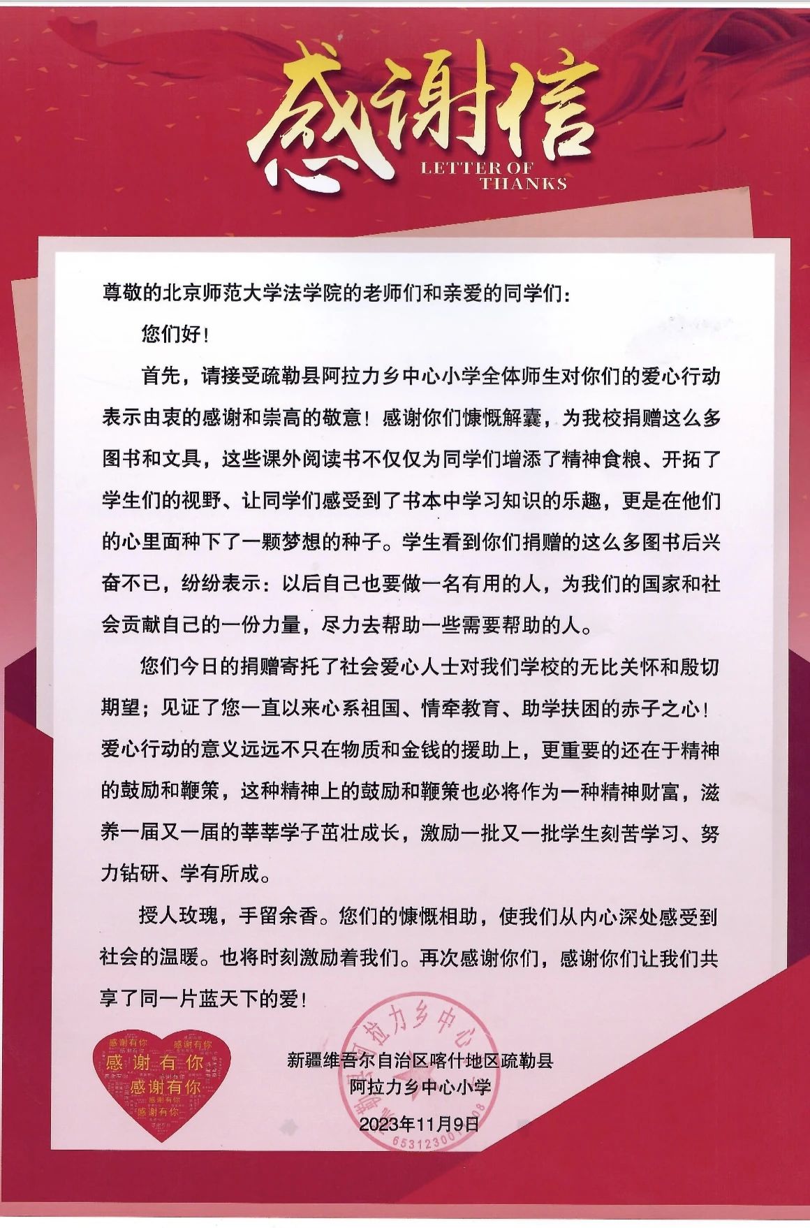 自2022年“助力南疆 法育未来”爱心助学物资捐赠活动后,cn影院 再次举办2023年“捐书留香 再会南疆”向新疆喀什地区疏勒县阿拉力乡小学捐赠活动。近期,这些来自首都北京的物资满载着温暖和关心、祝福和寄望抵达目的地,为孩子们的秋冬学期带来了浓浓的暖意。