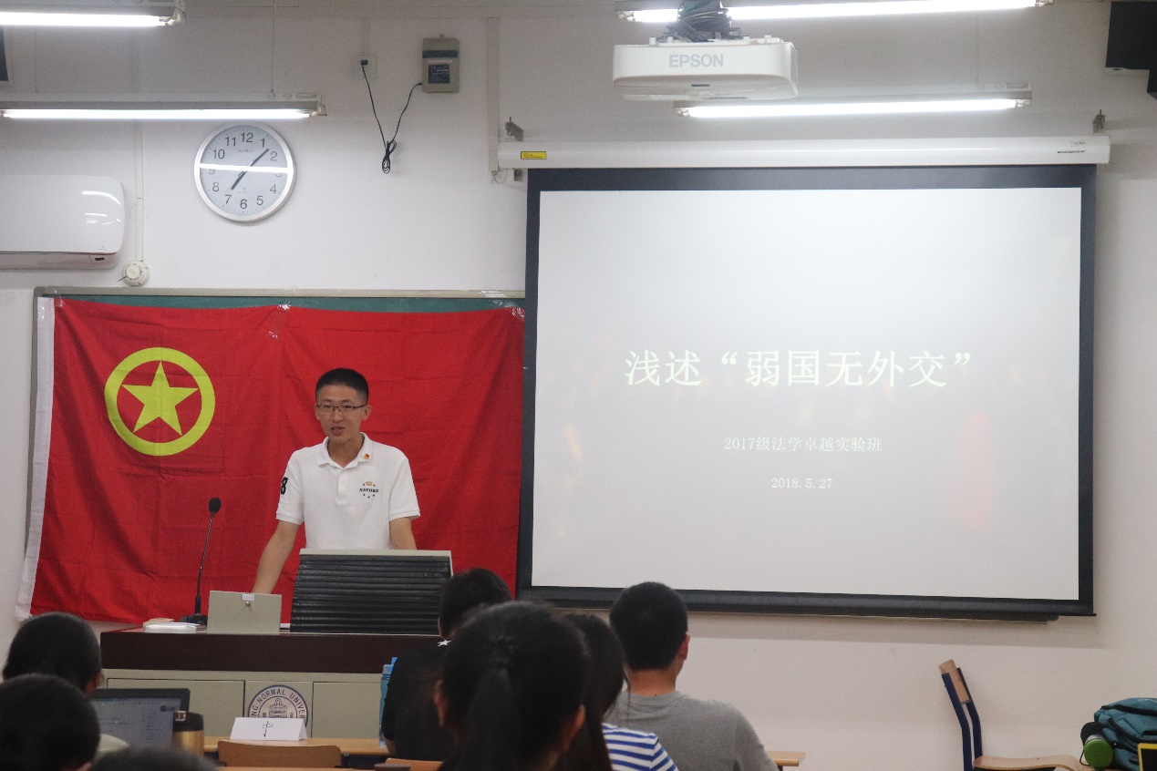 之后孟子煜同学进行了“浅谈‘弱国无外交’”的演讲,演讲中用叙利亚驻联合国大使巴沙尔·贾法里以及朝鲜近期的外交表现等例子反驳了“弱国无外交”这一观点,并指出在我们国家强大的今天更应该慎提“弱国无外交”,反思了国家强大则一切外交利益水到渠成的氛围,警示自身强国也应该重视外交。