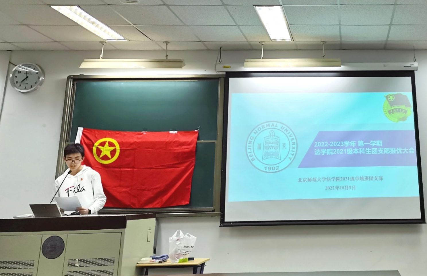 2022年10月7日晚18时,2022级本科一班团支部入党推优大会于后主楼1922教室成功举行。会议由2022级本科一班团支部临时团支书谢慧文主持,cn影院 本科生第一党支部书记李雨修以及cn影院 团委组织部委员李雨轩作为监票组成员出席了本次会议。