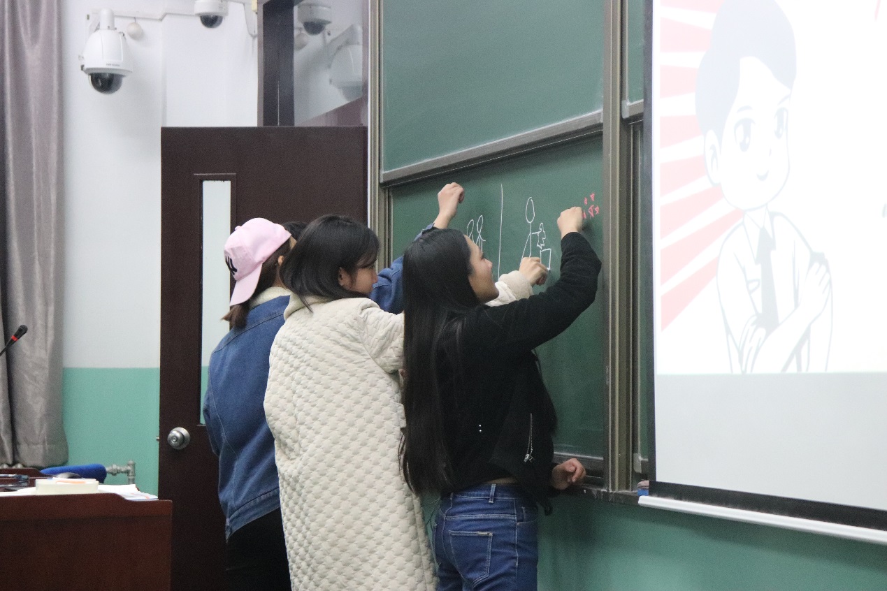 班委们首先简要总结汇报了上学年的班级工作开展情况,并结合自身对社会主义核心价值观做了理解阐释。紧接着,为了增加主题班会的趣味性,提高同学们的参与度,我们开展了“社会主义核心价值观”12个词的你画我猜活动。同学们纷纷报名,踊跃参加,在黑板上通过绘画的方式向同学们传达自己所理解的社会主义核心价值观。