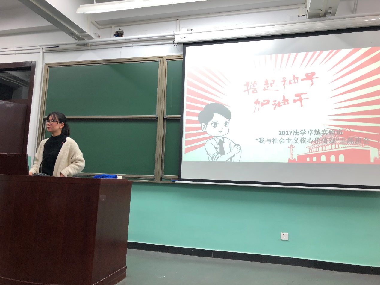 2018年10月27日晚,2017级法学卓越实验班在教十110教室开展了“我与社会主义核心价值观”主题班会暨班委换届选举。
