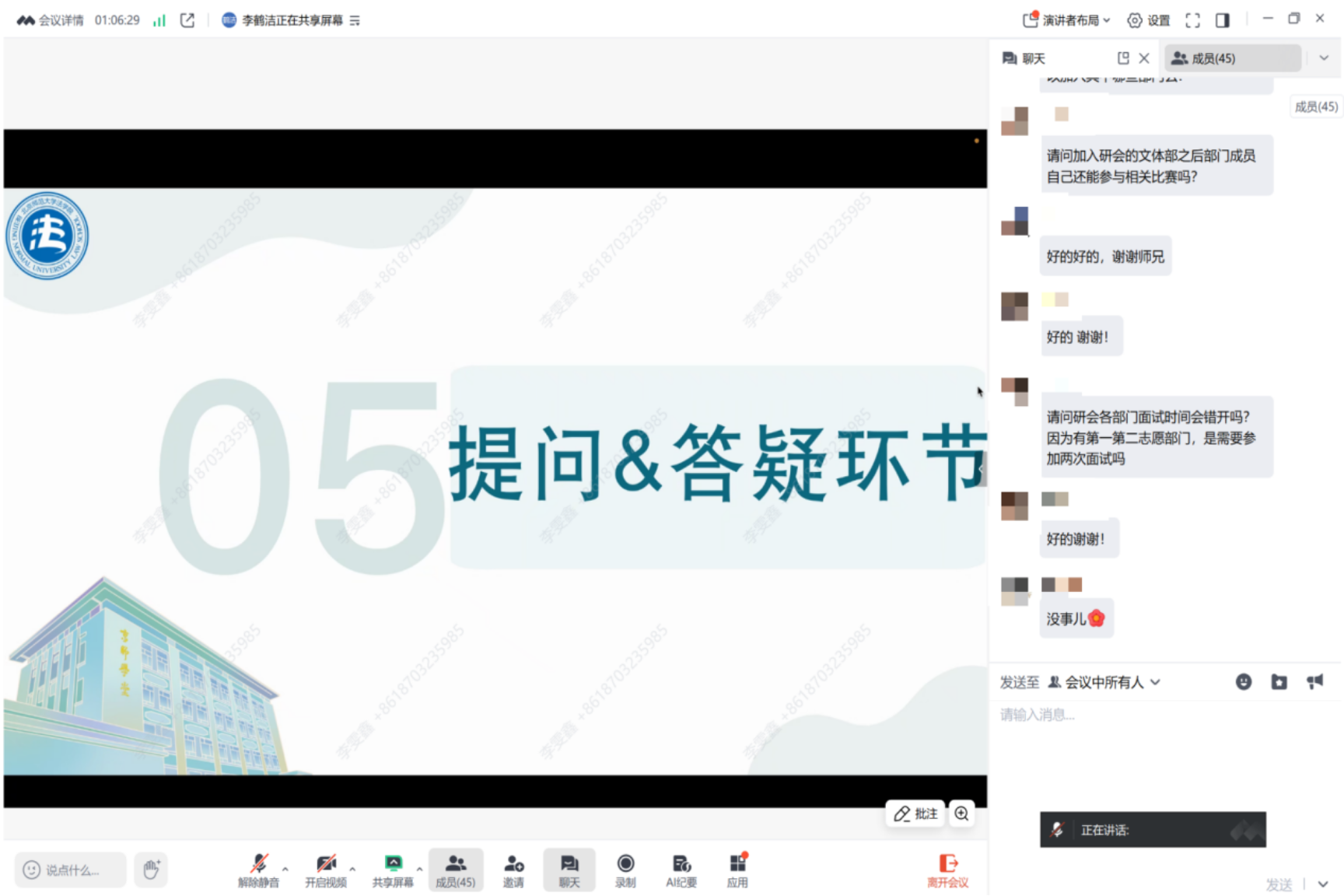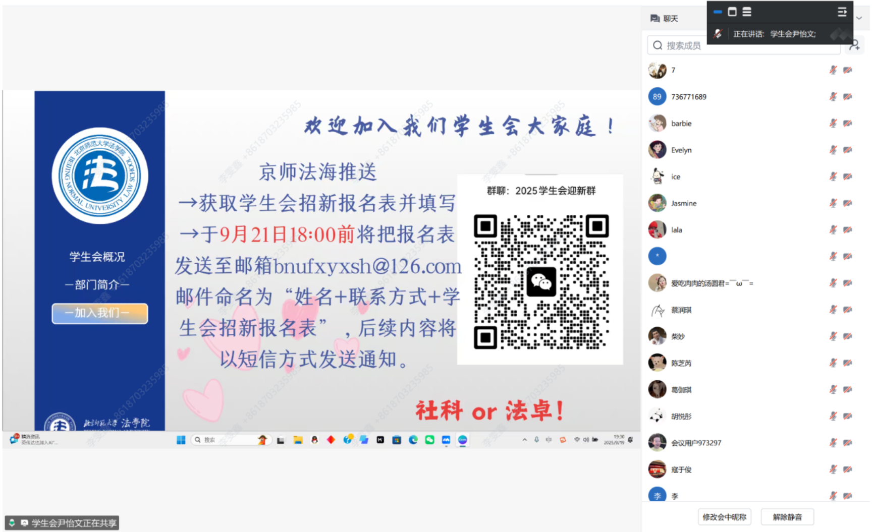 cn影院 团学研组织招新宣讲会于9月19日晚在线上圆满举行。cn影院 团委副书记、各部门委员,研究生会主席团成员,学生会主席团成员及cn影院 本硕博新生等共计七十余人参加本次宣讲。宣讲会由团委组织部委员李鹤洁主持。宣讲会上,各部门负责人依次亮相,为同学们详细介绍工作内容与招新计划,展现出团学研组织的活力与包容。