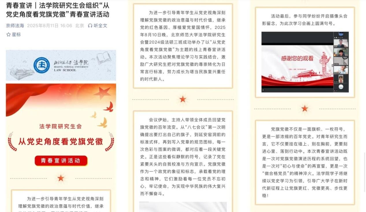 发布“与宪同心,与法偕行”等6篇理论学习成果推文,开展“从党史角度看党旗党徽”等2门青春宣讲课程。