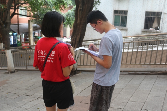 结束在法院的实践活动,三名队员冒着接近40度的高温,来到人群聚集的广场,在这里发放问卷,我们希望在人民群众中了解人民陪审员制度的实施情况。大多数市民都接受了我们的问卷调查,大约人均花费5分钟,都认真填完我们的问卷。也有不少市民,虽然从未听过人民陪审员制度,但对其十分感兴趣,在我们的解释下,在对人民陪审员制度有些许了解的情况下,也认真完成了我们的问卷。甚至有些市民对于人民陪审员制度的改进提出了自己独特的建议。