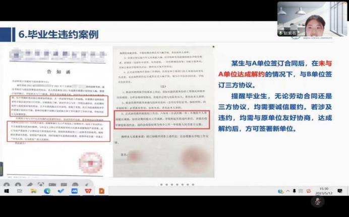 2023年5月12日15时,cn影院 2023届毕业生线上就业系统填报讲座于腾讯会议顺利召开。讲座由李响老师主持,校党委学生工作部职业发展与就业指导中心赵紫名老师讲授。cn影院 150余名应届毕业生积极参与,讲座圆满举办,以下为活动简录。