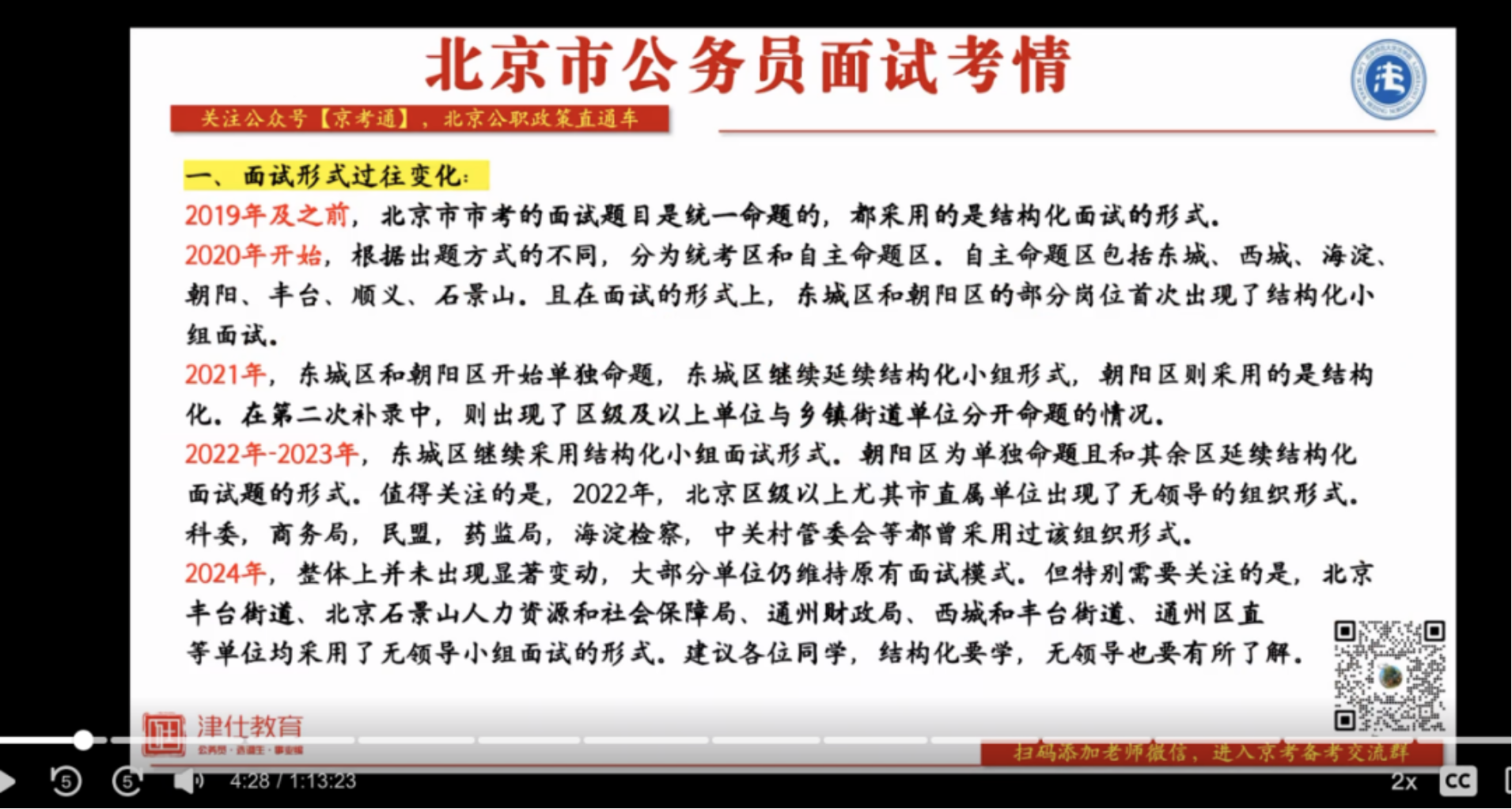 讲座首先回顾了近年来北京市公务员面试形式的变化趋势。北京市考在2019年之前采用统一命题和结构化面试形式,2020年开始出现统考区和自主命题,但整体上仍然是结构化面试为主。东城区和朝阳区在自主命题过程中出现了结构化小组的面试形式。2022年,北京区级以上尤其市直属单位出现无领导小组形式的面试。