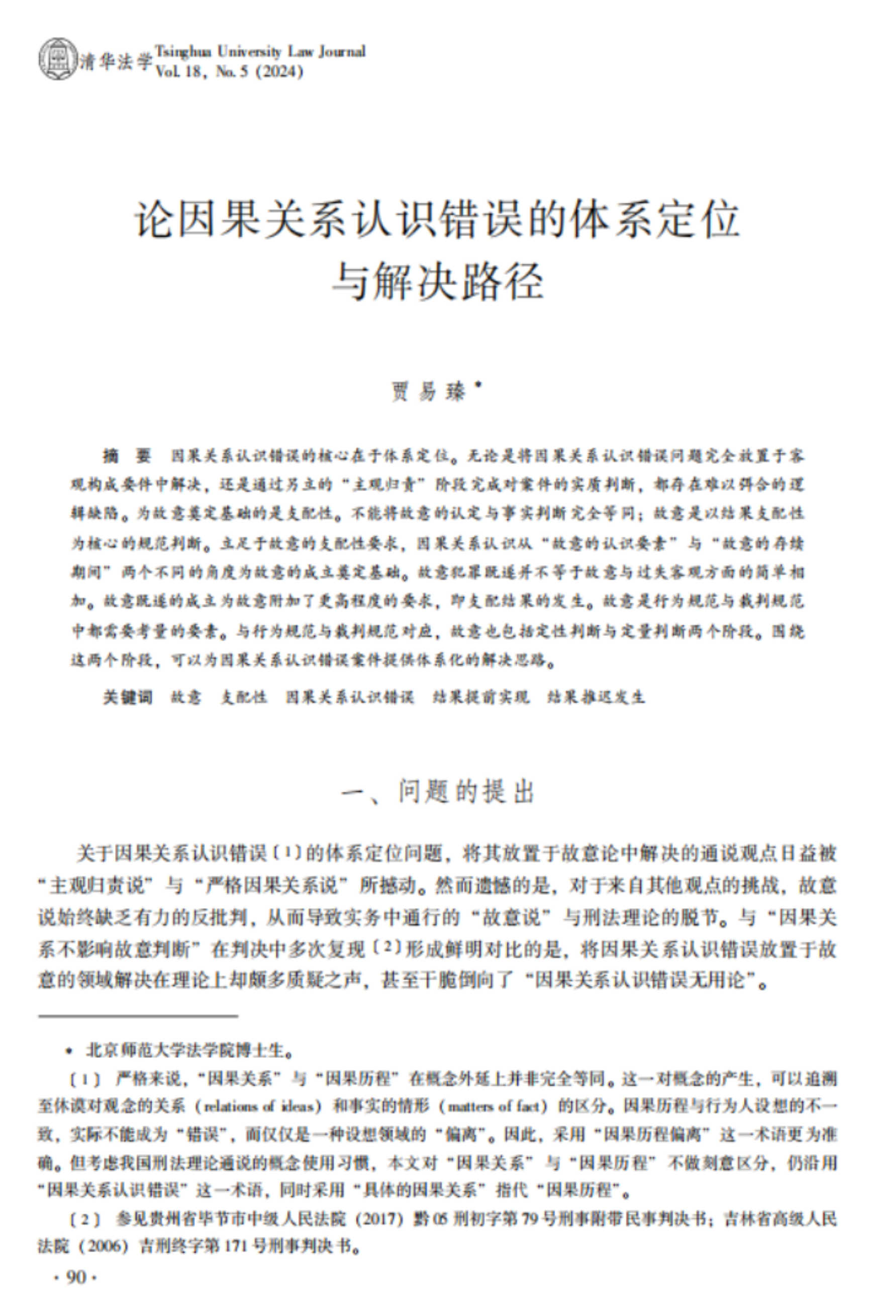 《清华法学》2024年第5期刊载了cn影院 刑法学博士生贾易臻同学的论文“论因果关系认识错误的体系定位与解决路径”,论文认为:立足于故意的支配性要求,故意是行为规范与裁判规范中都需要考量的要素。与行为规范与裁判规范对应,故意也包括定性判断与定量判断两个阶段,围绕这两个阶段,可以为因果关系认识错误案件提供体系化的解决思路。据悉,贾易臻同学是cn影院 2022级博士生,师从黄晓亮教授,研究方向为刑法学。近年来,cn影院 通过连续举办“全国刑事法博士生论坛”“京师法学博士生论坛”“京师法学学术研究生沙龙”等系列活动,邀请青年学者、资深专家与硕士、博士研究生交流、研讨,有效地提升了研究生的学术研究和论文写作能力。