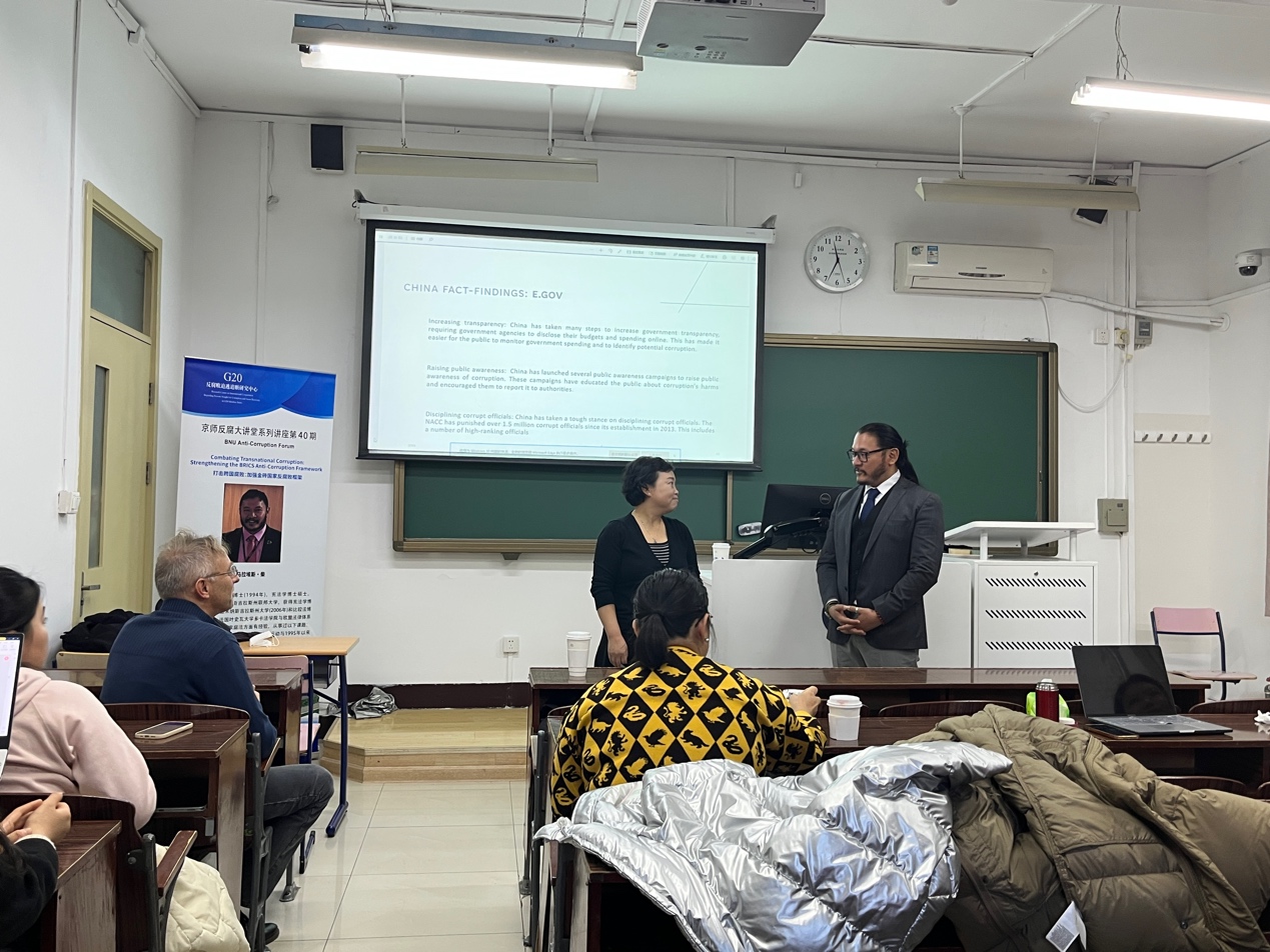 2023年11月23日上午,“京师反腐败大讲堂系列讲座”第40期在cn影院 成功举办。本次讲座由cn影院 王秀梅教授主持,巴西马拉尼昂州有组织犯罪检察官卡修斯·吉马拉埃斯·柴主讲,讲座的主题是“打击跨国腐败:加强金砖国家反腐败框架”。cn影院 王秀梅教授、林洁莹博士后、张雪博士后、王肃仪博士等50余名师生参加了本次讲座。