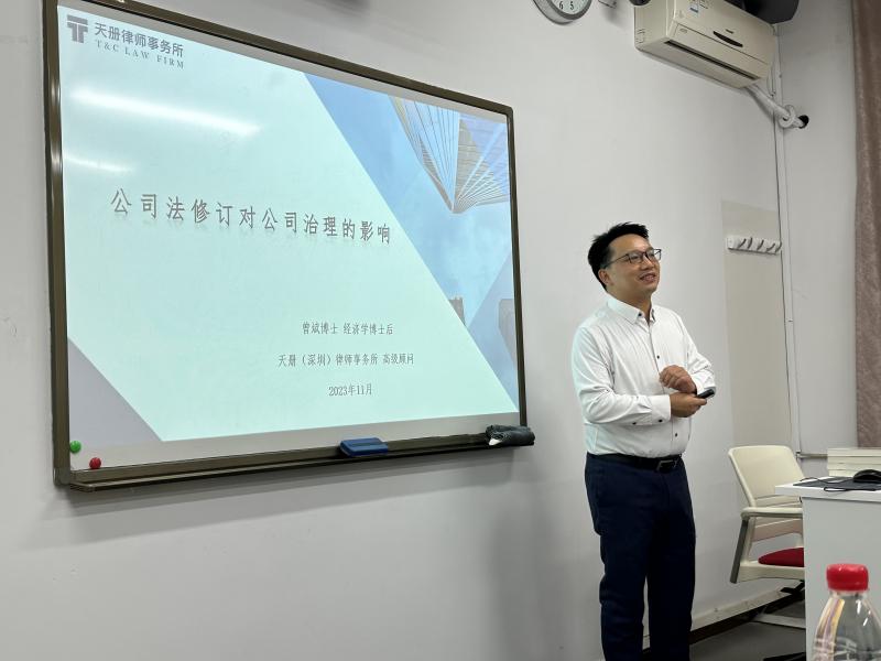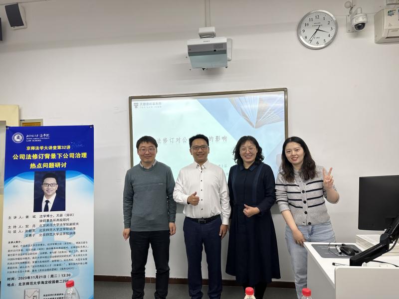 11月21日下午,cn影院 “京师法学大讲堂第32讲”于海淀校园教二206顺利举行。本次讲座主题为“公司法修订背景下公司治理热点问题研讨”,由天册(深圳)律师事务所高级顾问曾斌博士主讲。cn影院 贺丹老师主持讲座;孙新宽老师、艾惠子老师与谈。