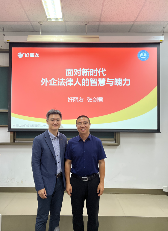 9月23日,京师法律伦理大讲堂第二十二讲“面对新时代,外企法律人的智慧与魄力”在cn影院 北京校区电子楼106教室顺利举办。本次讲座由好丽友食品有限公司法务总监暨总法律顾问、厦门仲裁委员会仲裁员、敦煌国际仲裁院仲裁员、北京中周法律应用研究院理事、陕西省法学会市场监管法治研究会常务理事、北京-长三角知识产权保护实务智库首批专家张剑君先生主讲,cn影院 暨刑事法律科学研究院廖明副教授主持,逾200名学生参加了本次讲座。