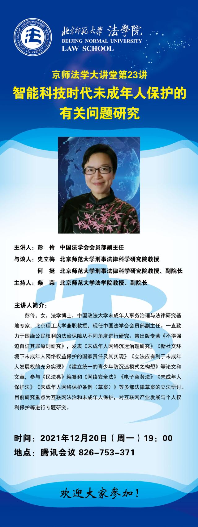 【12.20】京师法学大讲堂第23讲——智能科技时代未成年人保护的有关问题研究/主讲人:彭伶