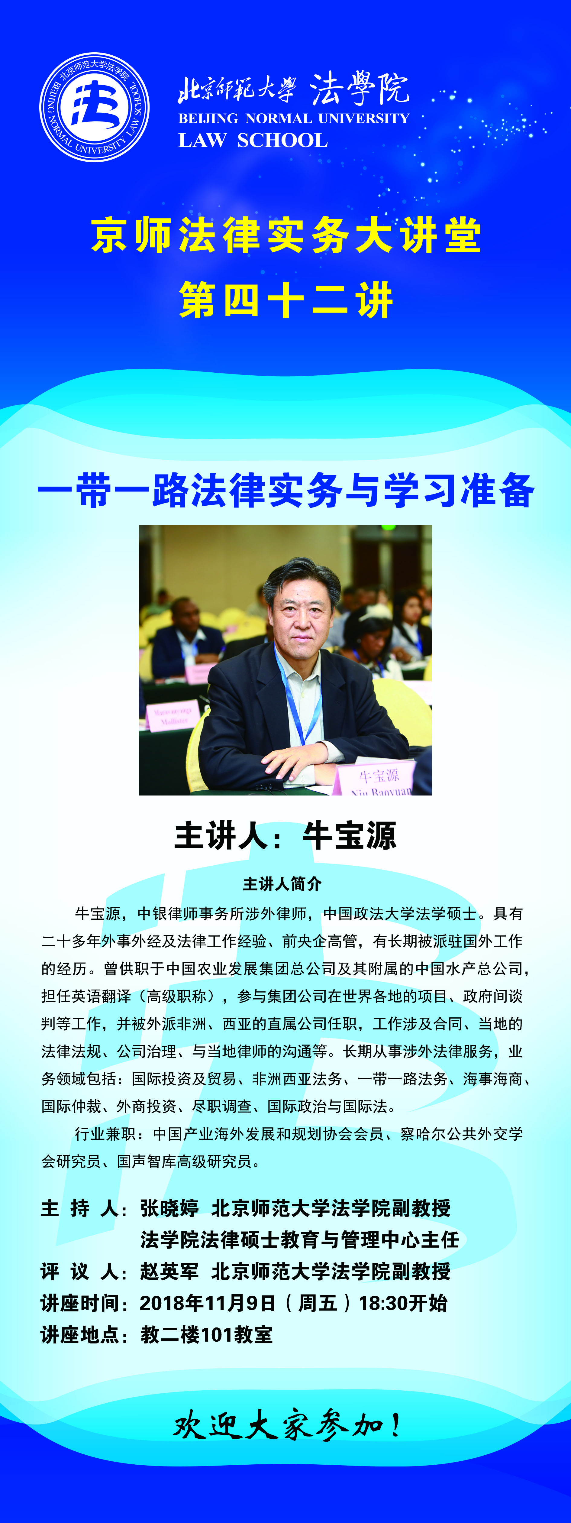 京师法律实务大讲堂第四十二讲在教二楼101教室成功举办。本次讲座特别邀请到中银律师事务所牛宝源律师担任主讲人,讲座主题是“一带一路法律实务与学习准备”。cn影院