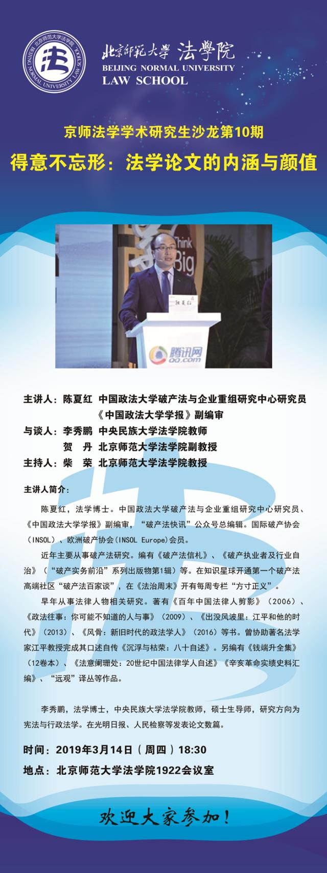 【03.14】京师大学学术研究生沙龙第10期--得意不忘形:法学论文的内涵与颜值/主讲人:陈夏红