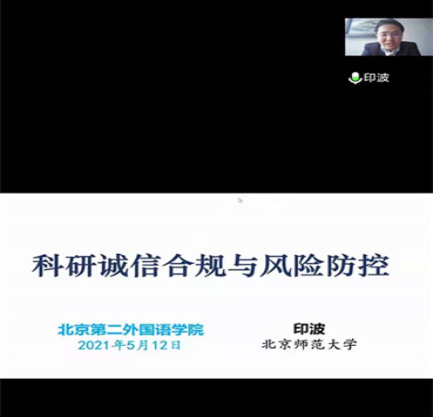 2021年5月12日下午,cn影院 学术委员会顾问,cn影院 副教授印波应北京第二外国语学院之邀,通过腾讯会议,为该校师生作了题为“科研诚信合规与风险防控”的学术诚信专题培训。培训讲座近300人参加。