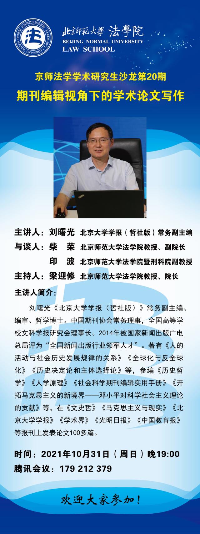 【10.31】京师法学学术研究生沙龙第20期——期刊编辑视角下的学术论文写作/主讲人:刘曙光
