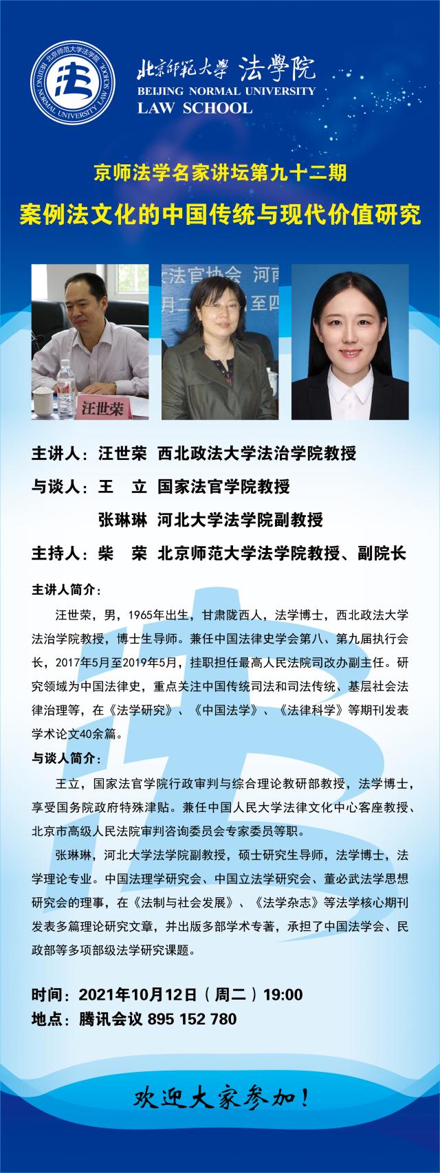 【10.12】京师法学名家讲坛第九十二期——案例法文化的中国传统与现代价值研究/主讲人:汪世荣