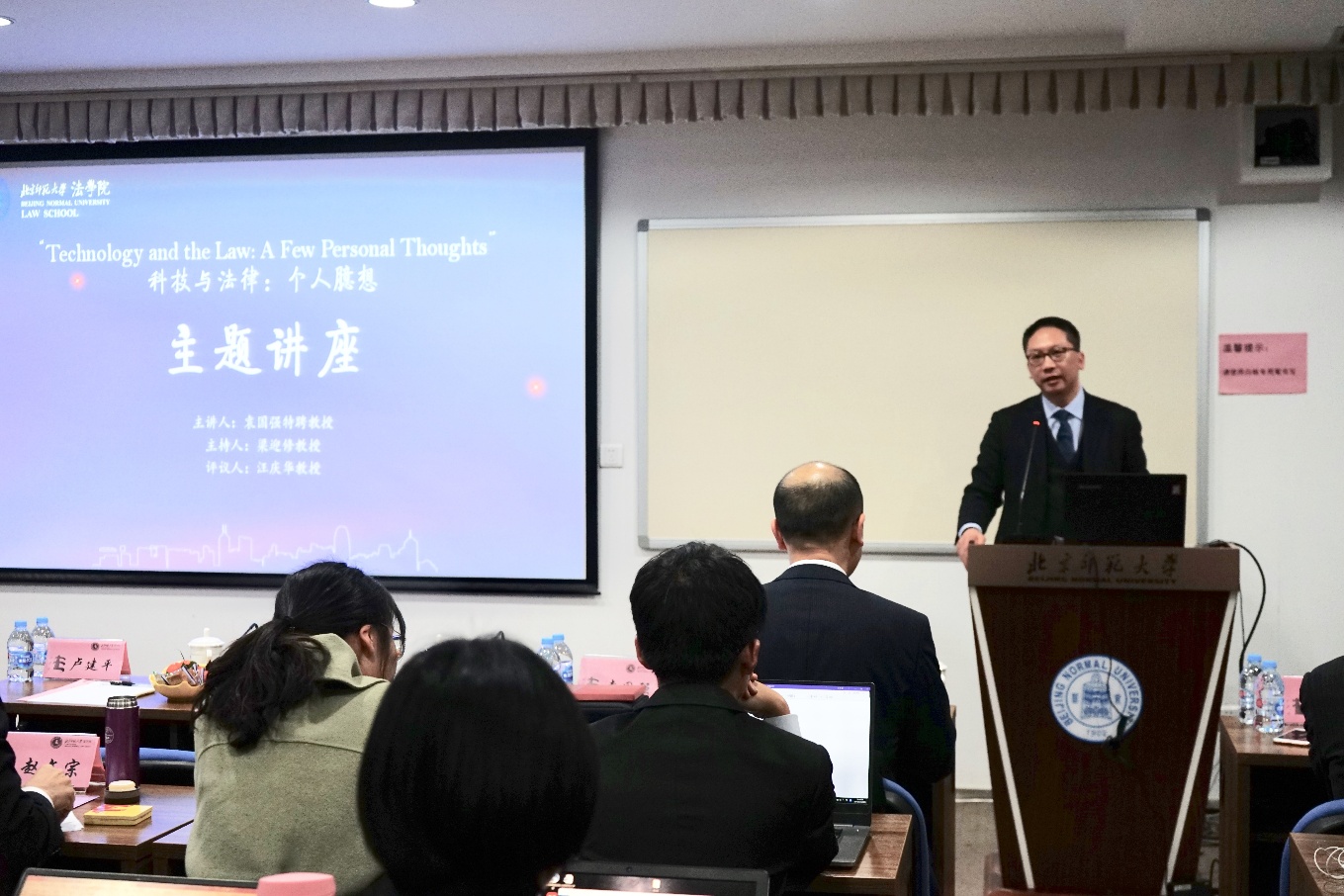稍作休息后,由袁国强特聘教授作了题为“Technology and the Law: A Few Personal Thoughts”的主题讲座。袁国强特聘教授首先简要讲述了科技影响人类生活的时代大背景,以及新时期法律人面对新的科技发展形势的责任与担当。之后,袁国强特聘教授从虚拟货币、人工智能、数据安全等三个科技前沿领域作为切入点,剖析了在科技迅猛发展的形势下,相对滞后的现有法律体系所面临的困境与挑战。面对这些问题,他指出在保障科技创新发展的前提下通过法律对科技进行规制的重要性,强调了国际合作在处理科技与法律的关系中的关键作用。讲座结束后,汪庆华教授进行了精彩的评议,着重讲述了各大数据平台融入公共管理以及私人生活的现状,对法律所面临的巨大挑战做了全面深入的分析。