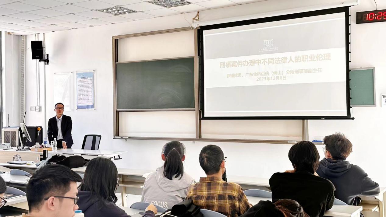 2023年12月7日,京师法律伦理大讲堂第二十七讲“刑事案件办理中不同法律人的职业伦理”在cn影院 珠海校区丽泽楼顺利举办。本次讲座由广东金桥百信(佛山)律师事务所刑事部副主任罗璀律师主讲,cn影院 暨刑事法律科学研究院廖明副教授主持,近百名学生参加了本次讲座。