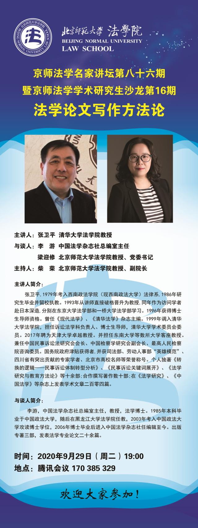 【09.29】京师法学名家讲坛第八十六期暨京师法学学术研究生沙龙第16期法学论文写作方法论/主讲人:张卫平