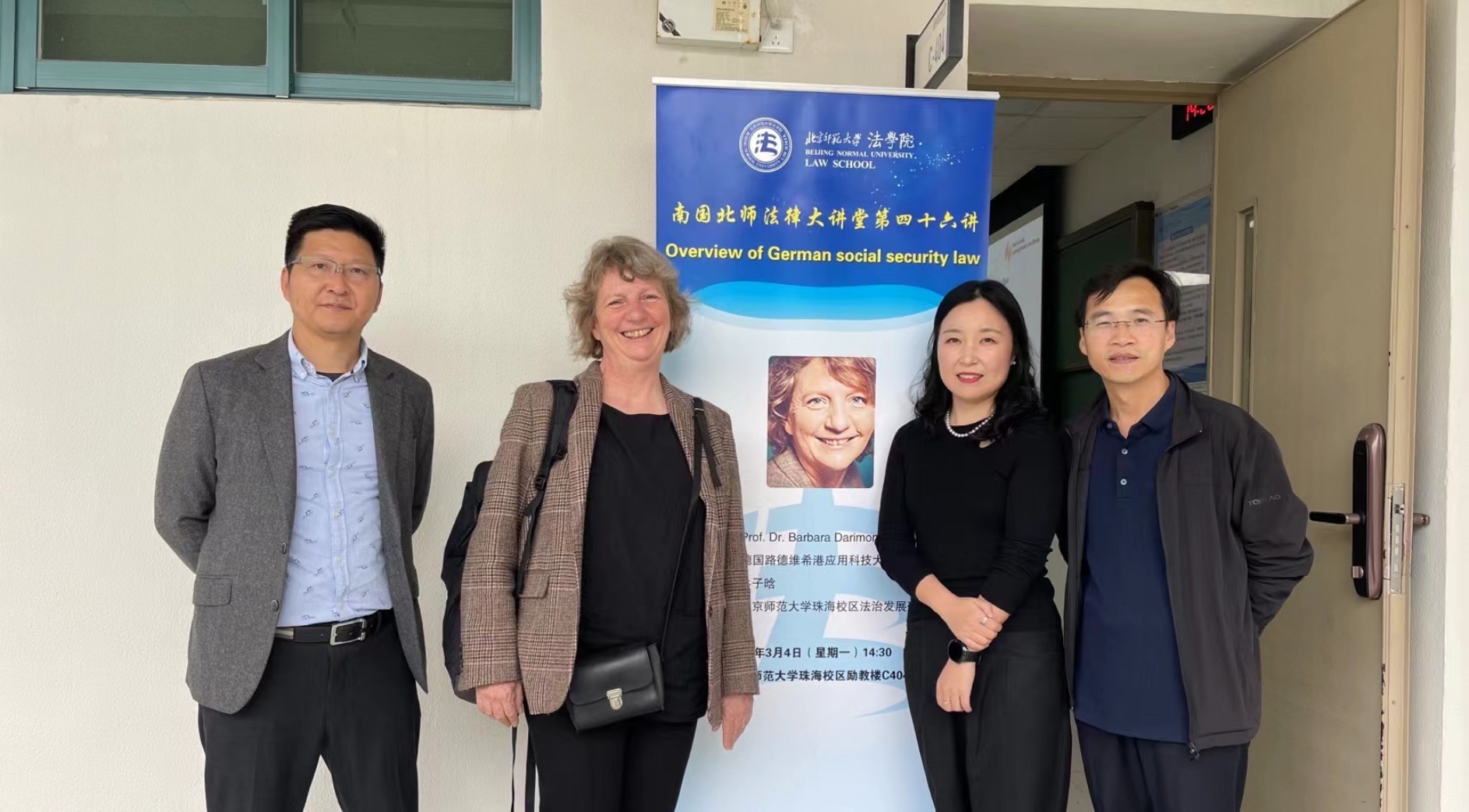 3月4日,南国北师法律大讲堂第四十六讲“Overview of German social security law”在cn影院 珠海校区励教楼C404顺利举行。本次讲座由德国路德维希港应用科技大学教授Barbara Darimont主讲,cn影院 法治发展研究中心牛子晗老师主持,cn影院 副院长、珠海校区法治发展研究中心主任袁治杰教授,珠海华发集团叶再兴博士与谈,cn影院 珠海校区硕博同学到场聆听学习。