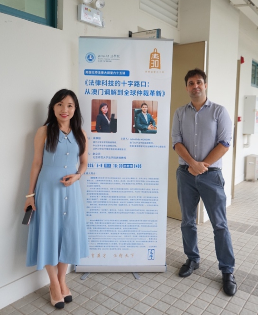5月9日,南国北师法律大讲堂第六十五讲《法律科技的十字路口:从澳门调解到全球仲裁革新》在cn影院 珠海校区励教楼C405圆满举行。本次讲座由澳门大学cn影院 助理教授、中国-葡语国家司法法律研究中心副主任João Ilhão Moreira老师与澳门大学cn影院 高级导师、中文法学士课程主任、法学士学位(中葡双语授课)课程主任梁静姮老师主讲,cn影院 讲席教授赵文宗老师主持。cn影院 珠海校区多名学生参与了本次讲座。