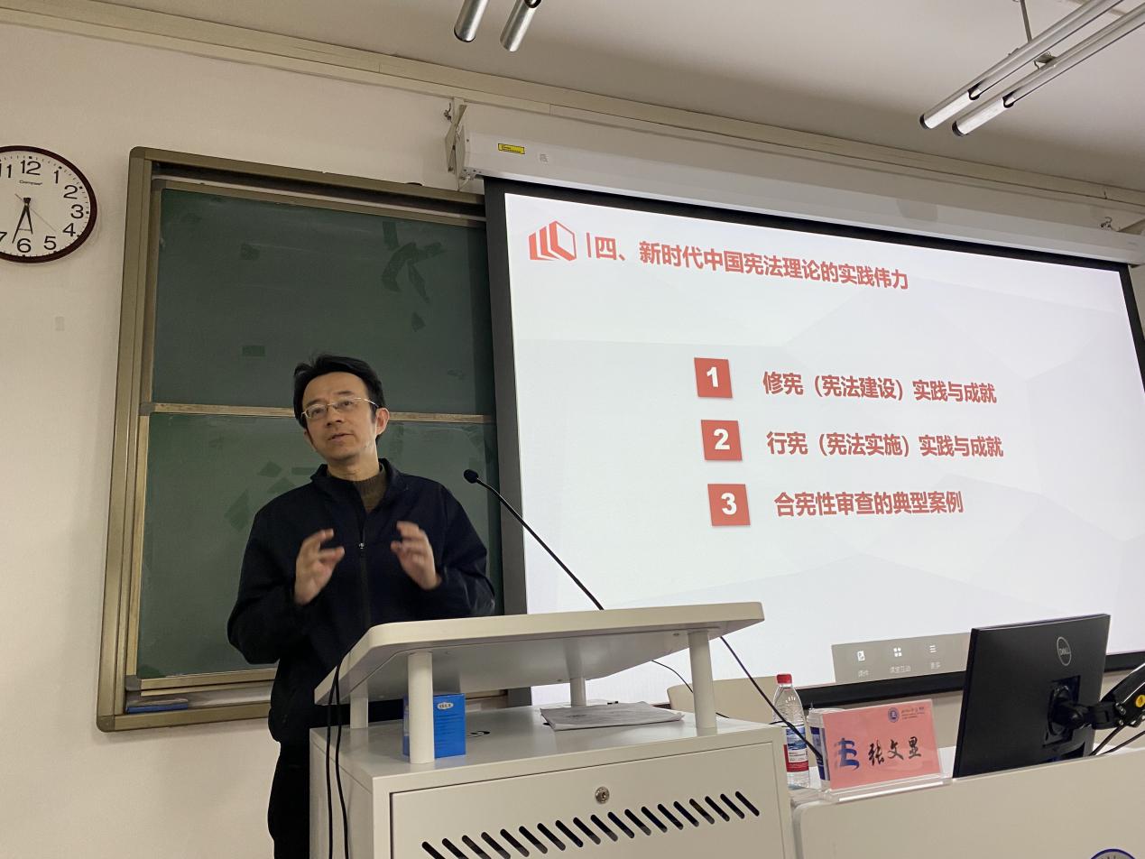 张文显教授在讲座中首先深入阐释了新时代中国宪法理论的核心要义和主要理论板块,核心要义集中体现在15个方面的重要论述,主要理论板块则包括宪法文明论、宪法本体论、宪法价值论、宪法制度论、宪法实践论、宪法学的认识论和方法论等。随后,张文显教授明确指出,新时代中国宪法理论深刻揭示了近代以来中国宪法发展的历史逻辑,深刻阐述了依宪治国、依宪执政的理据和内涵。他讲述了新中国立宪、修宪、行宪的故事,阐述了“两个首先要”的法理逻辑和科学内涵,分析了依宪治国、依宪执政与西方“宪政”的本质区别,内容深刻而生动。最后,张文显教授结合新时代中国宪法建设和实施的实践与成就、合宪性审查的典型案例,对新时代中国宪法理论的实践伟力做了精辟的阐释。本次讲座内容丰富、深入浅出、引人入胜,赢得了在场师生的热烈掌声。